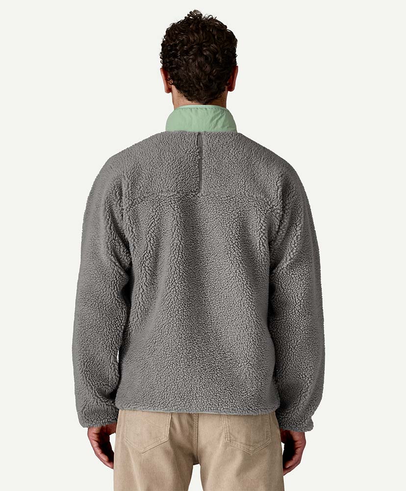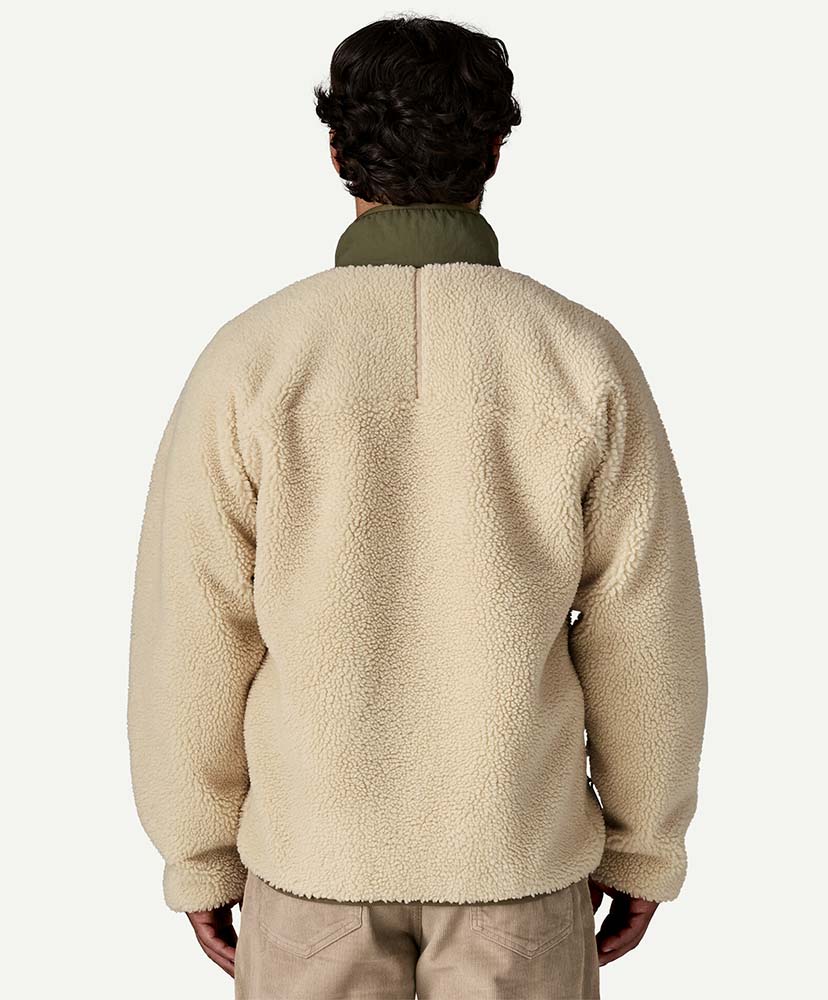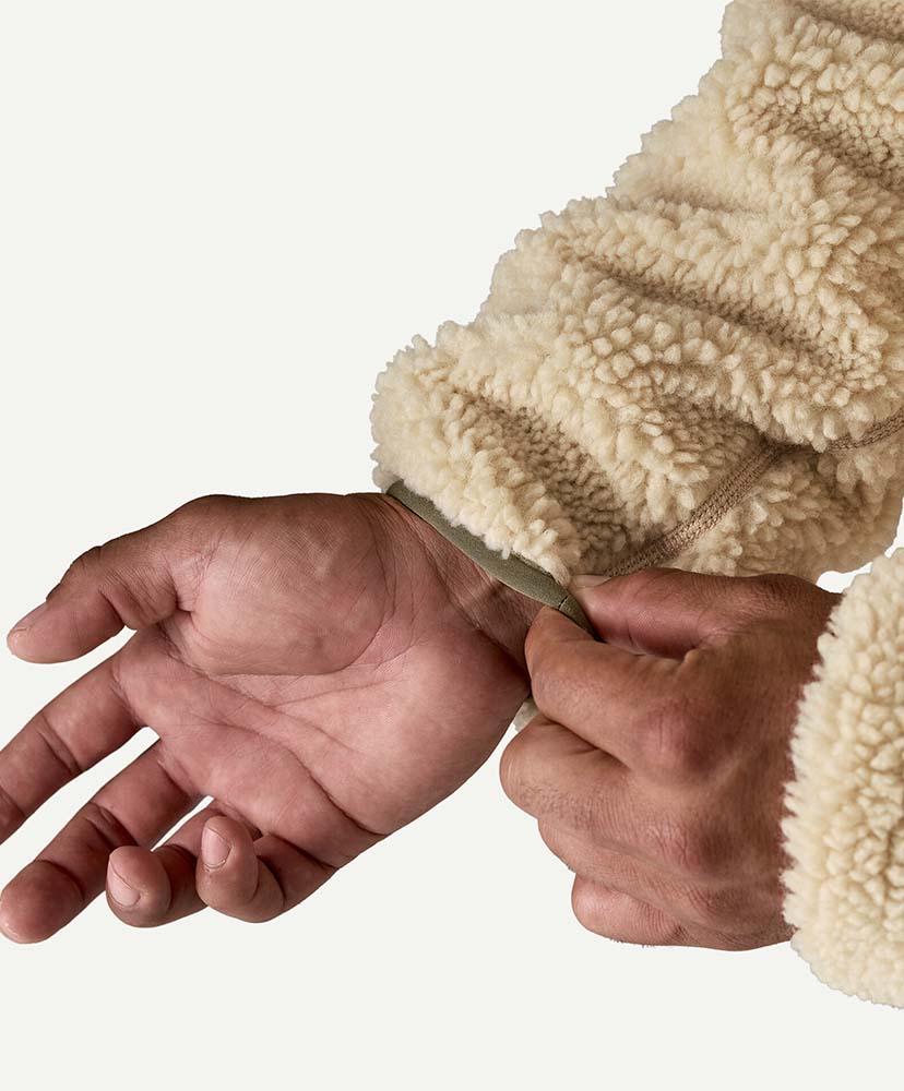 本体はオーシャンサイクル認証済みのリプリーブ・リサイクル・ポリエステル100%、6mm厚パイルフリースを使用し、温かく軽量。裏地にはリサイクル・ポリエステル100%タフタを採用し、PFASを意図的に使用せずDWR加工済み。襟や縁取り、ポケットには漁網をリサイクルしたネットプラス・ポストコンシューマーリサイクル・ナイロン100%を使用。すべてフェアトレード・サーティファイドの工場で製造。