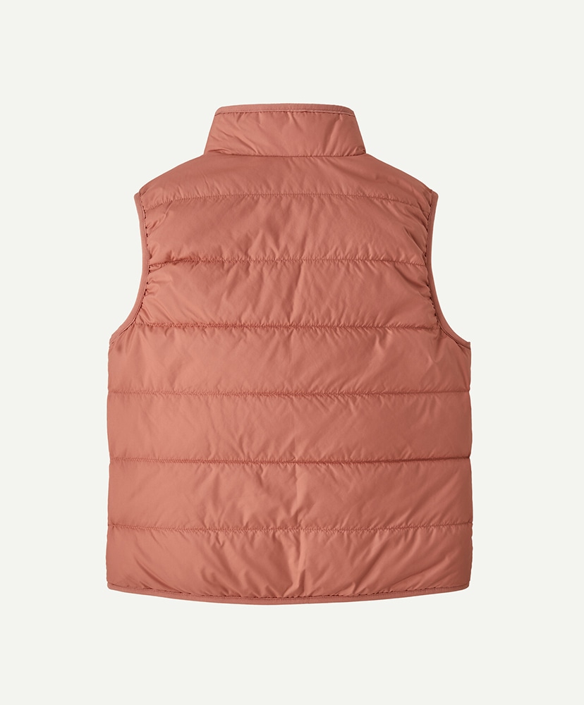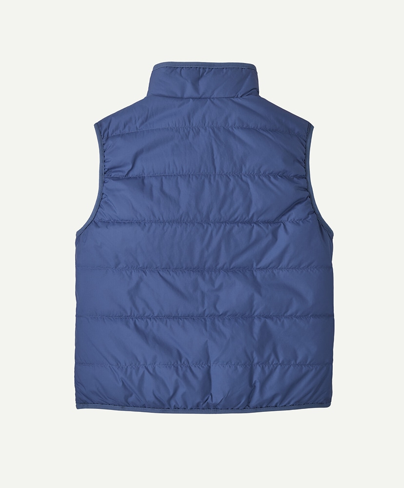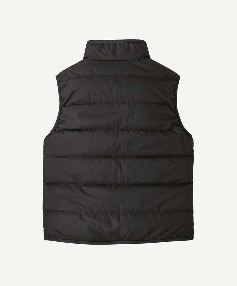 リバーシブル仕様で片面はキルト加工のダウン風セーター、もう片面はレトロX・ジャケットのスタイル。あらゆる季節の保温に活躍するキッズ用ベストです。