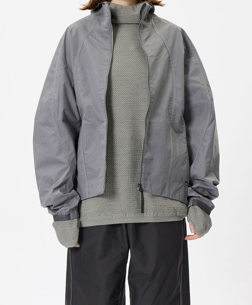 花のつぼみや種子から着想を得たフォルムで全体を縦のパネルで構成する、Goldwin 0のSeed Jacket のコンセプトを発展させたスタンドカラーのジャケット。コーティングを施した、タフなコットンポリエステル高密度リップストップ素材を使用。ハリ感のある素材によって、特徴的なシルエットを描きます。