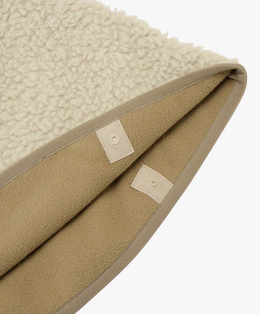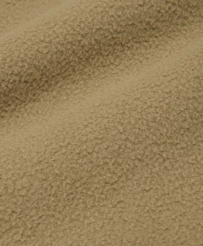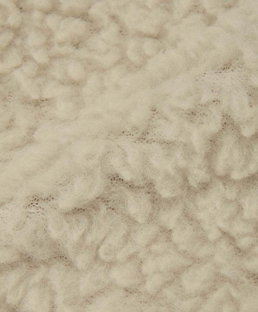 表面にはかさ高がある毛足の長いボアフリース、肌面には滑らかな肌触りのマイクロフリースをボンディングした生地を採用しています。