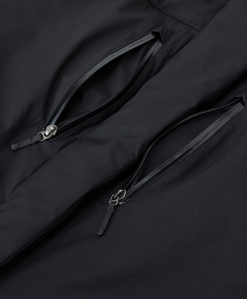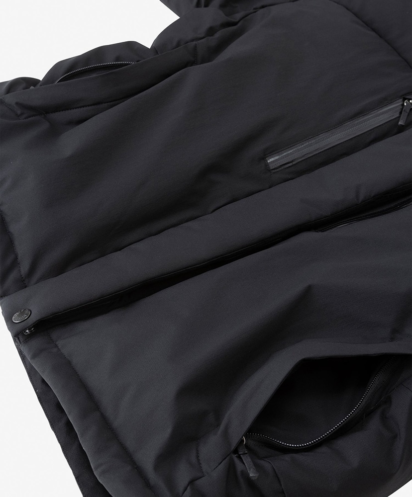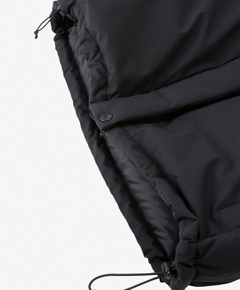 中わた入りの内襟やフロントのダブルフラップなどでコールドスポットを軽減。携行に便利なスタッフサック付きです。