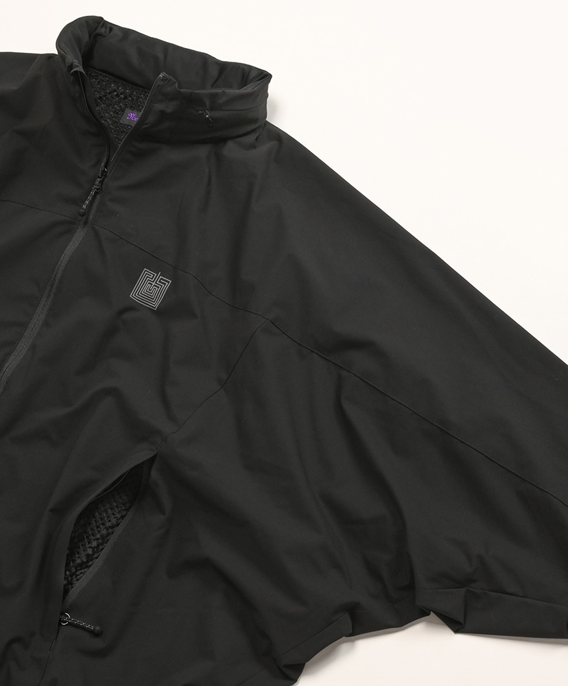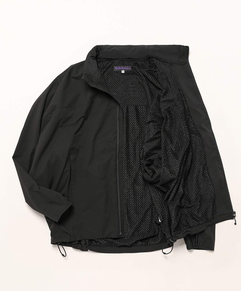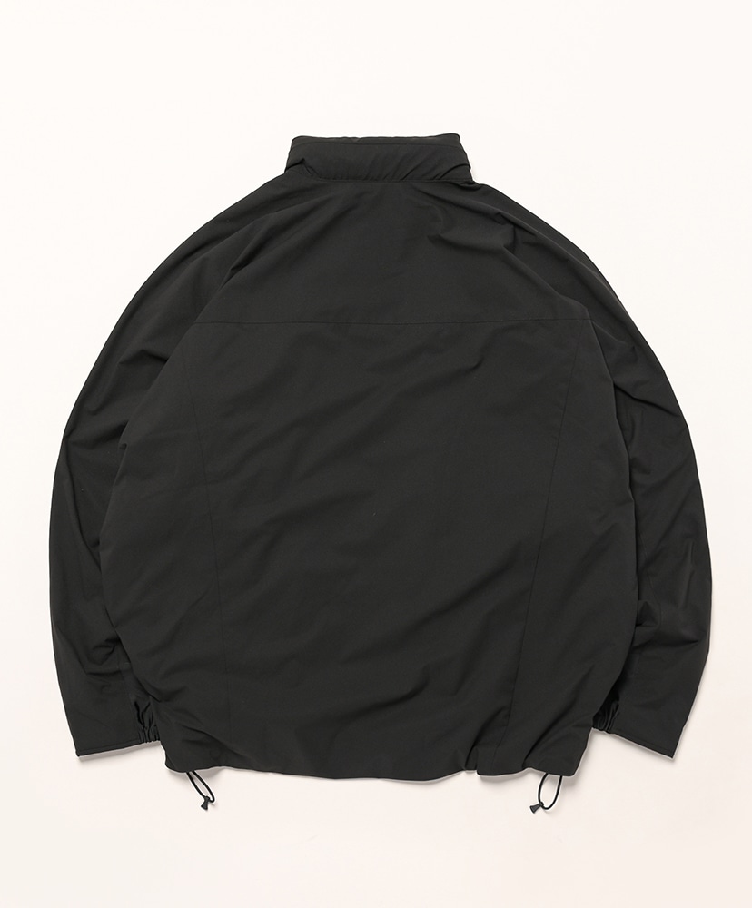 両側に配置されたジップポケットや袖のシャーリング、可動域が広がるドルマンスリーブやシルエット調整可能な裾のドローコードなど、シンプルながらギミックが光るウィンドベスト。