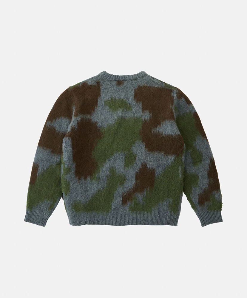 見た目も体感も温かな、ふわふわとしたモヘアブレンド糸による、デジタルカモ柄とチャコールグレーでの色展開のクルーネックニットです。