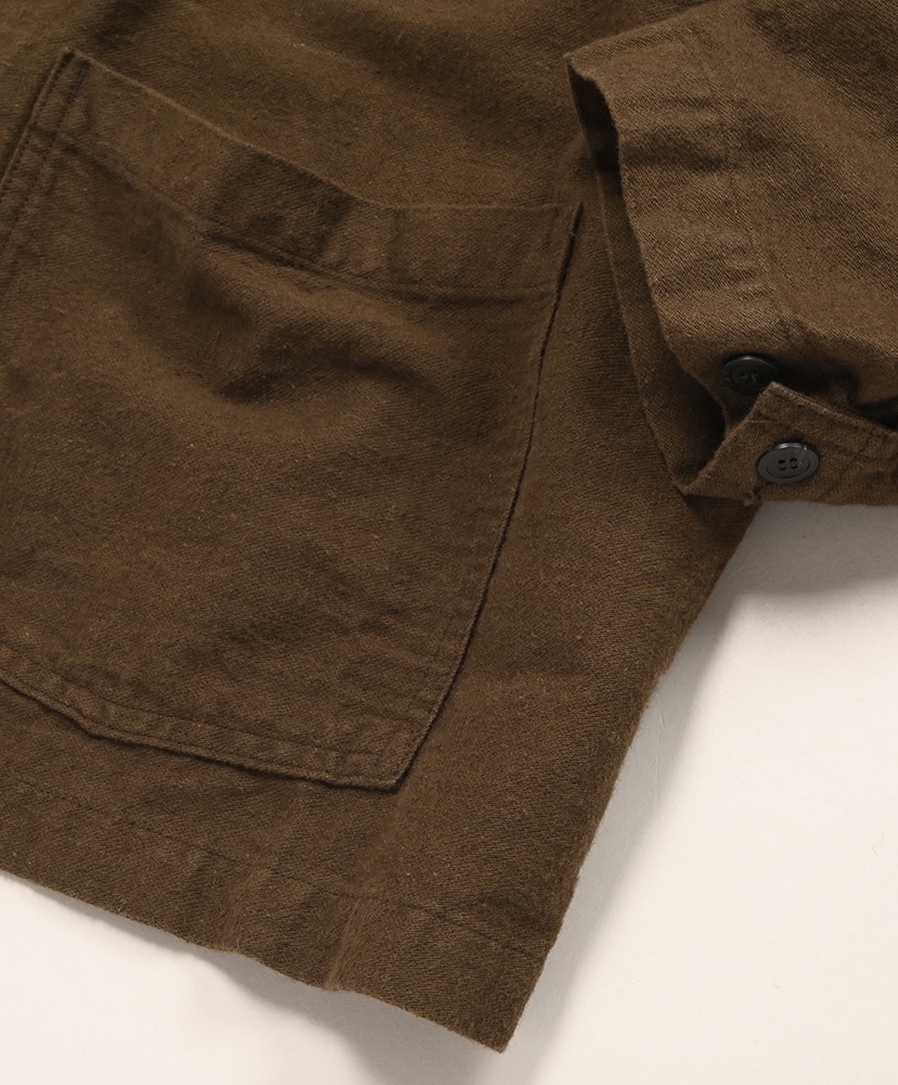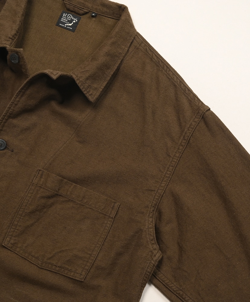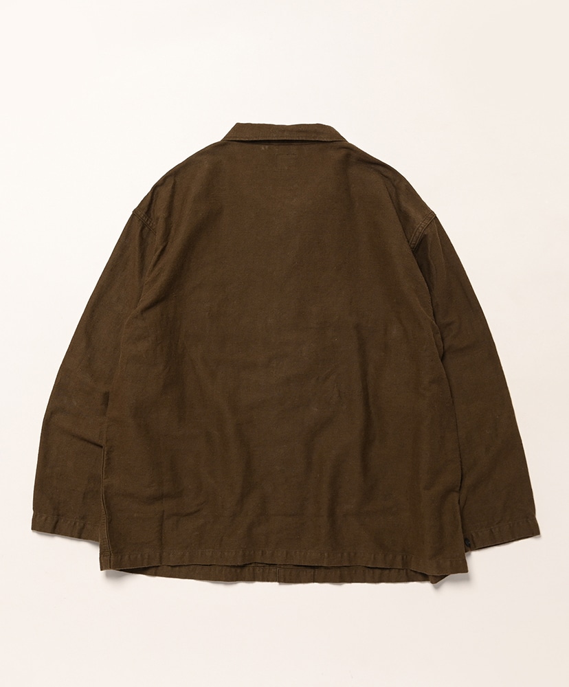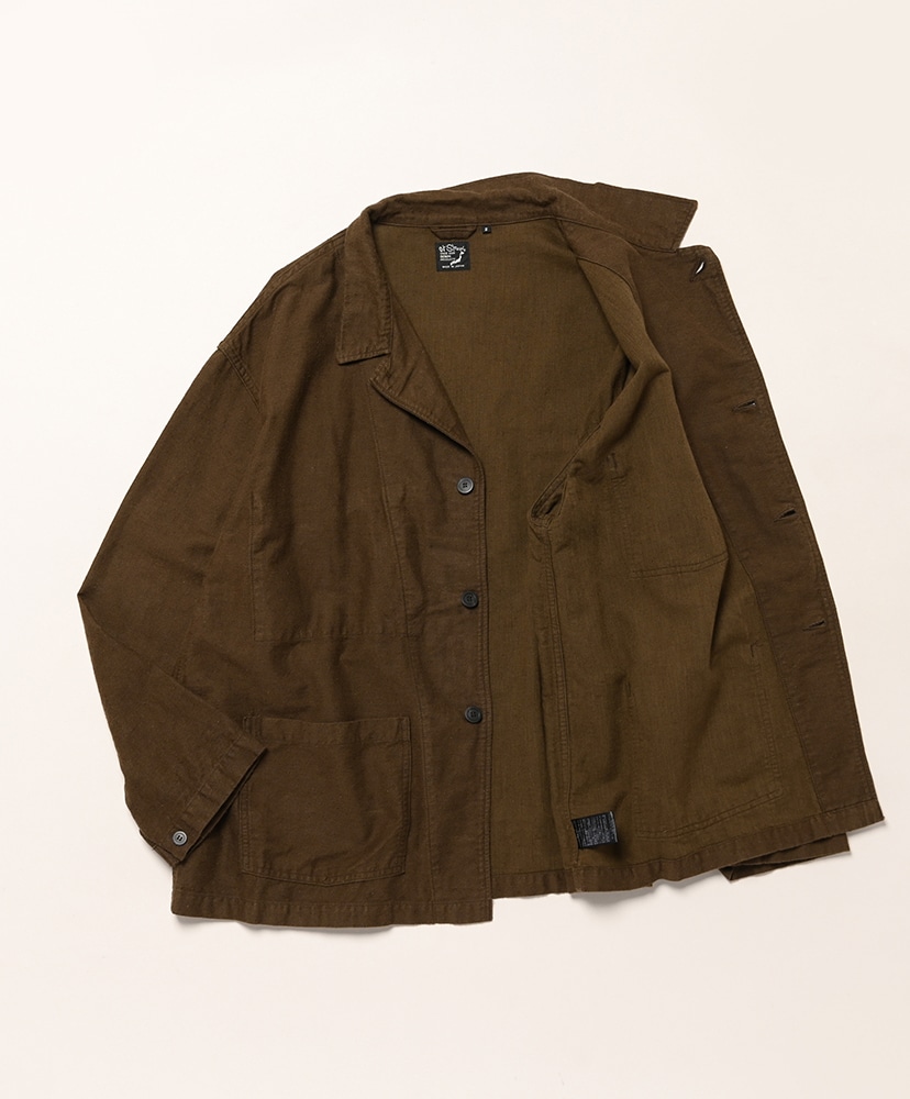 綿65%、麻35%の二重織モールスキンを使用した、RELAX FITのシンブルなワークジャケット。微起毛した軽い素材を使い、秋口から春先にとても便利なアイテムに仕上げました。UNISEXでの展開。