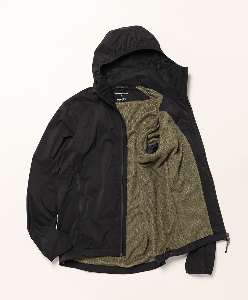 <Polartec®Alpha®Direct>は、野外活動中に保温性と通気性を兼ね備えた中綿として開発されたPolartec®Alpha®を、裏地なしでそのまま直接肌に触れる事を可能にした素材。