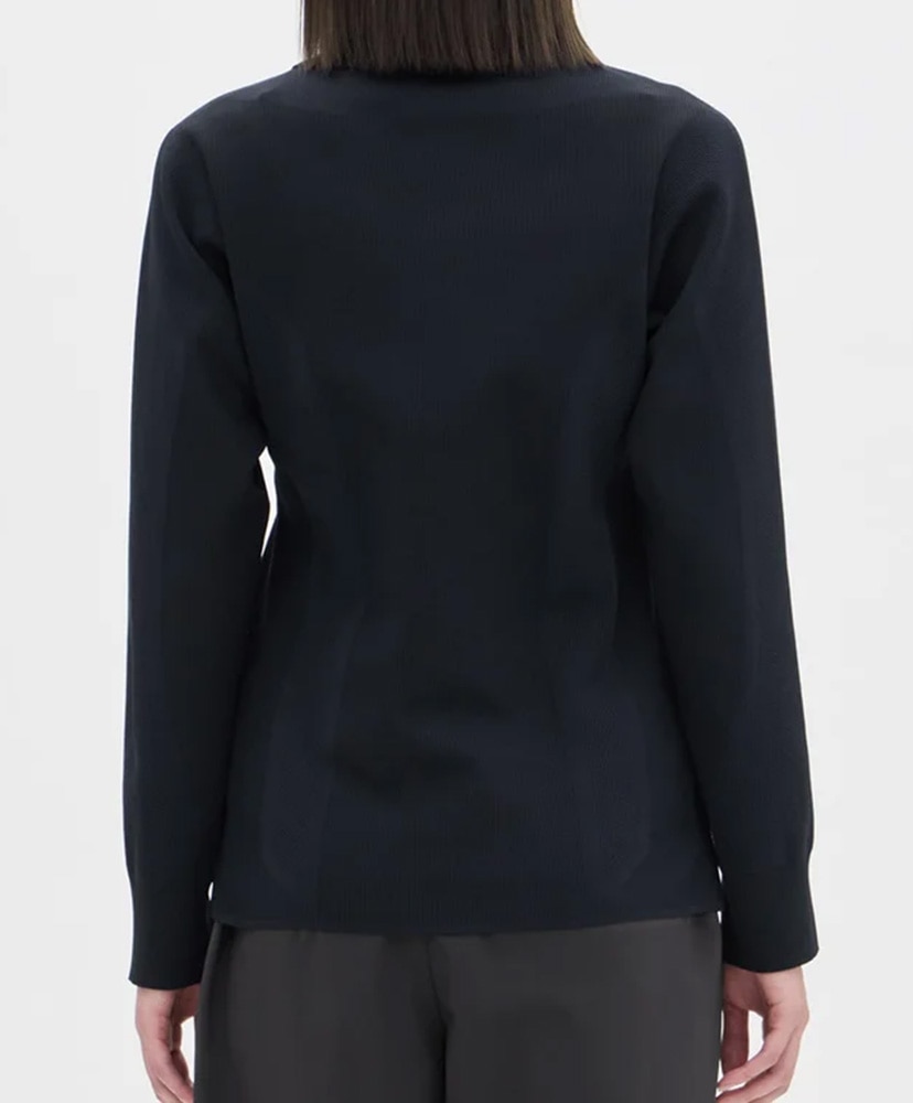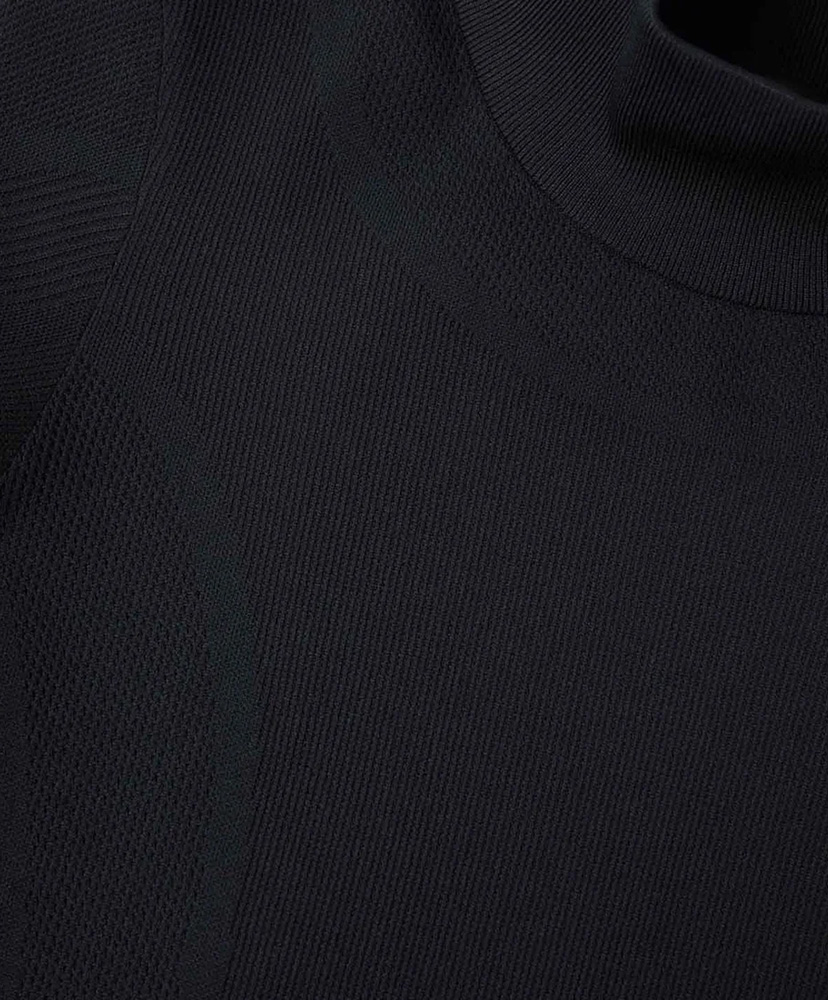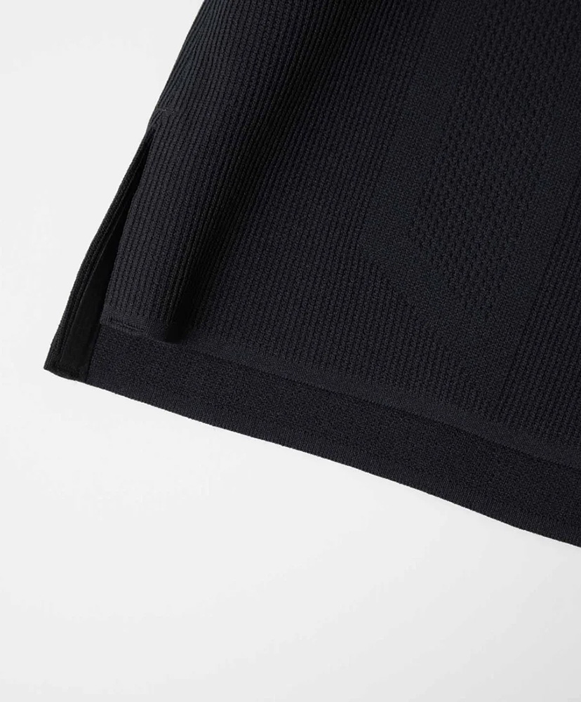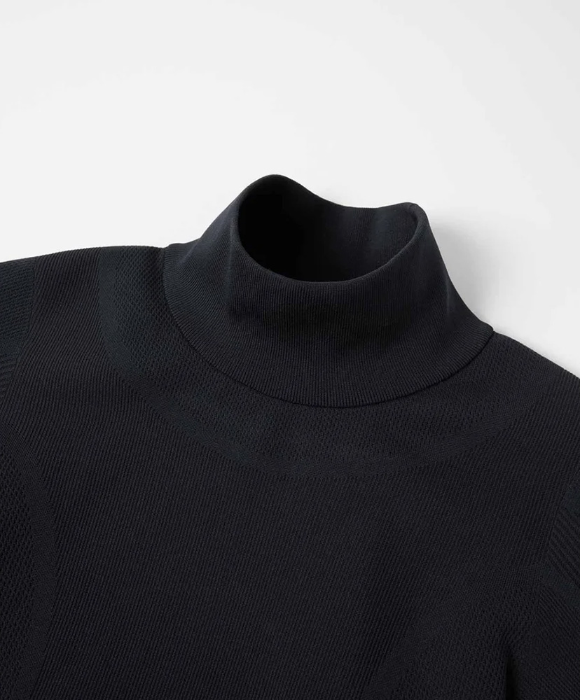 凹凸感のある表情に編み立てることで肌面との接触面積を減らし、快適な着心地が特徴的。ニットソーの製法を応用し、ウルトラソニック加工(超音波溶着加工)と熱接着加工との併用でシームレスデザインを実現した、運動性と快適性を両立したアイテム。洗練されたフェミニンなシルエットでボトムにタックインしたスタイルにもおすすめ。