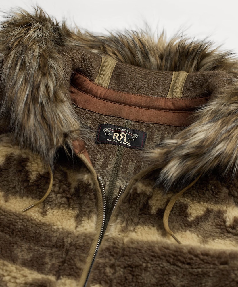 ・フェイクファーのトリム付きドローストリングフード / フルジップフロント / レザーのストッパーとジッパープル / コットンテープの縁飾り。