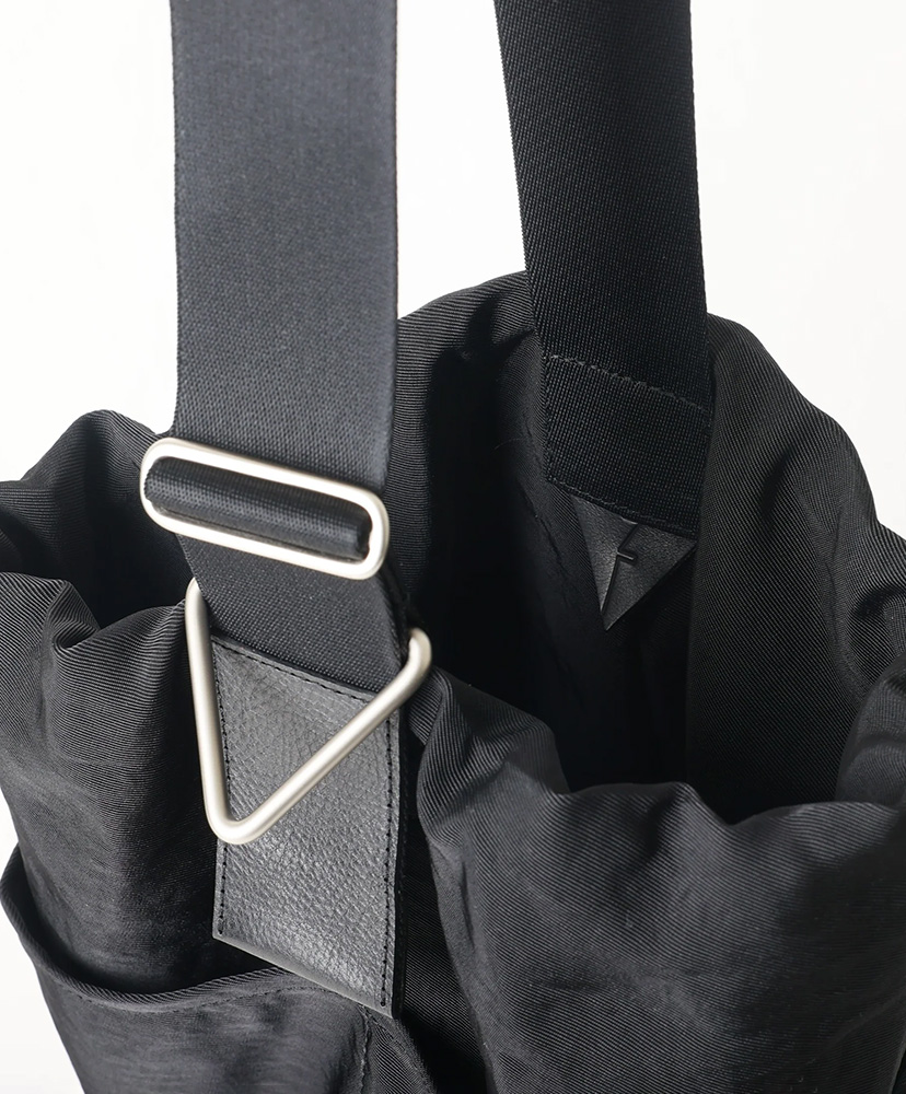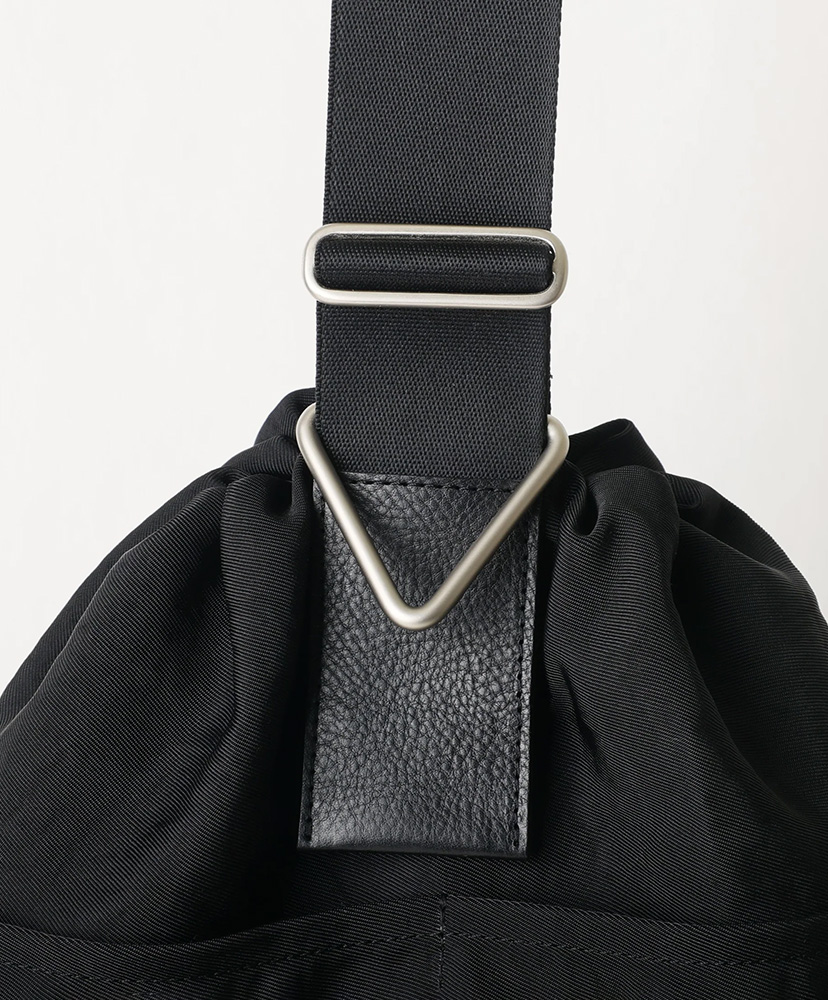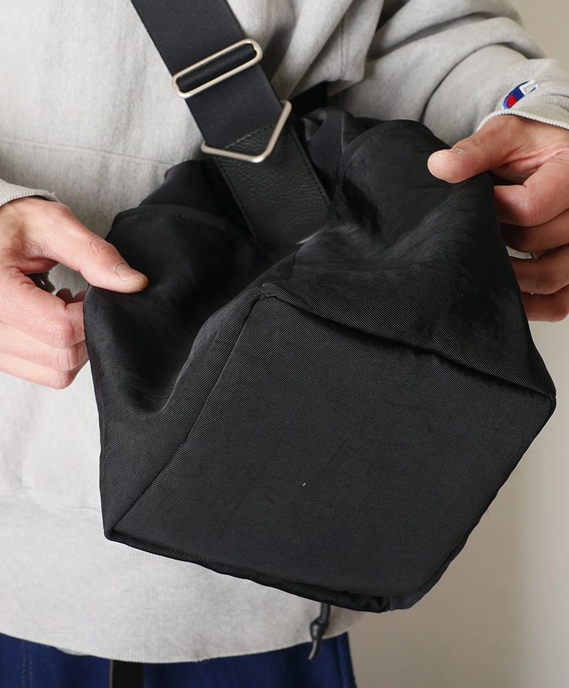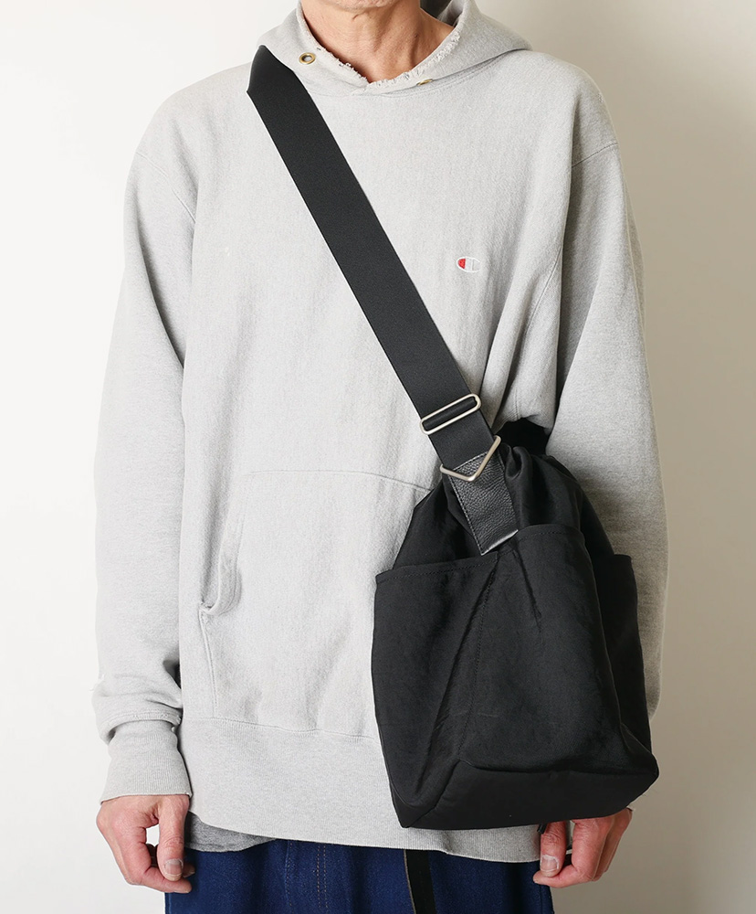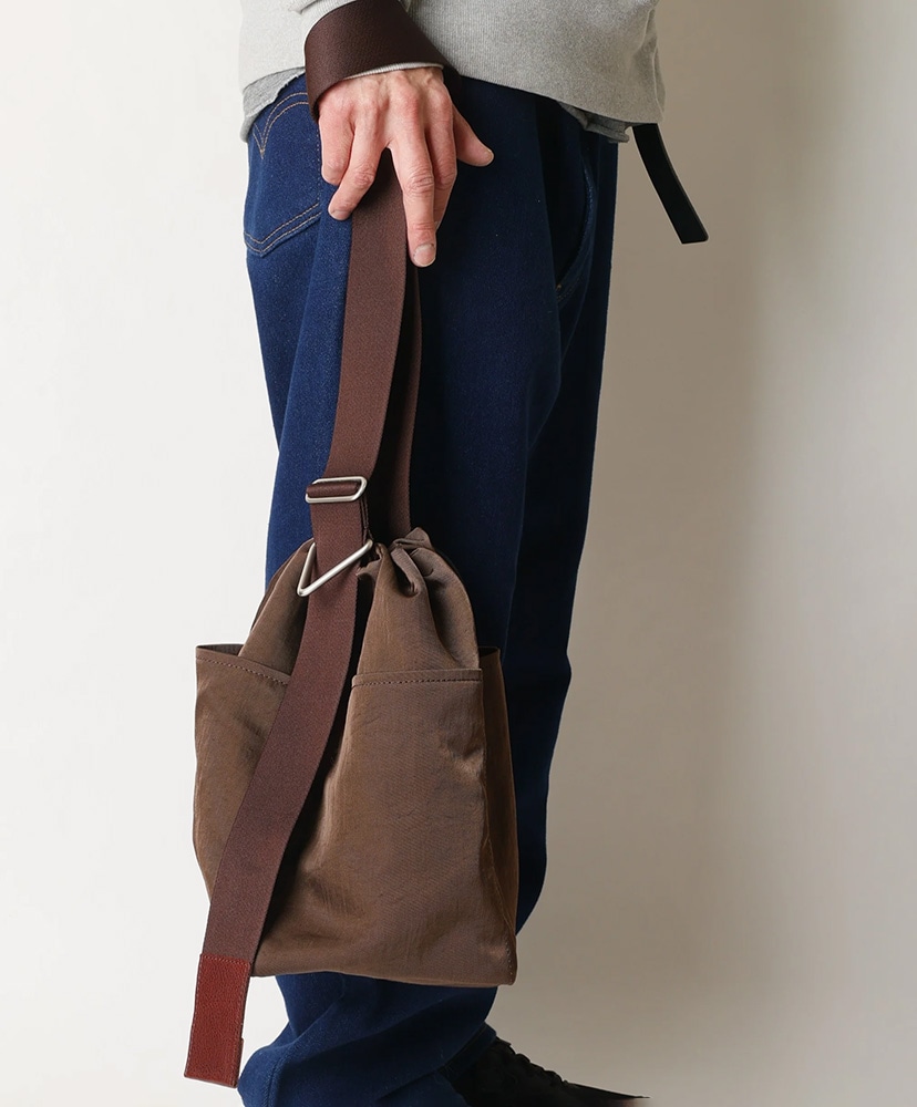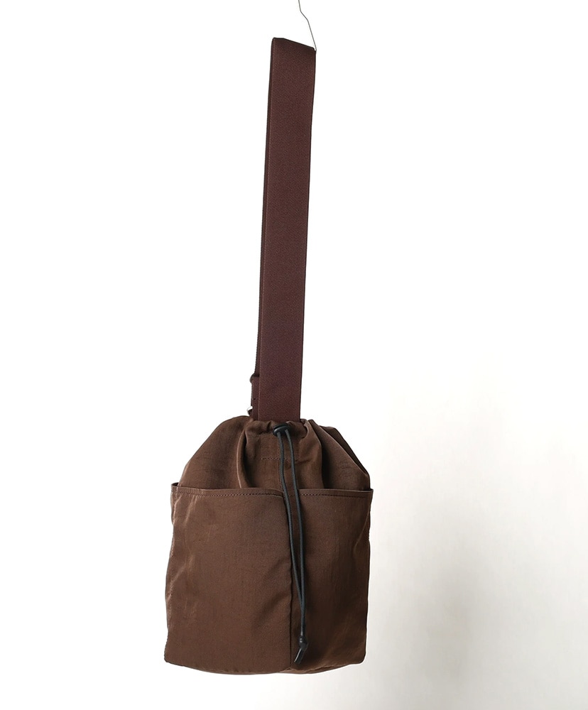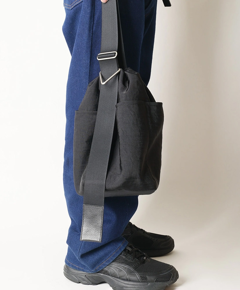 周りを囲うように4つの外部ポケットを配した、巾着型のショルダーバッグ。