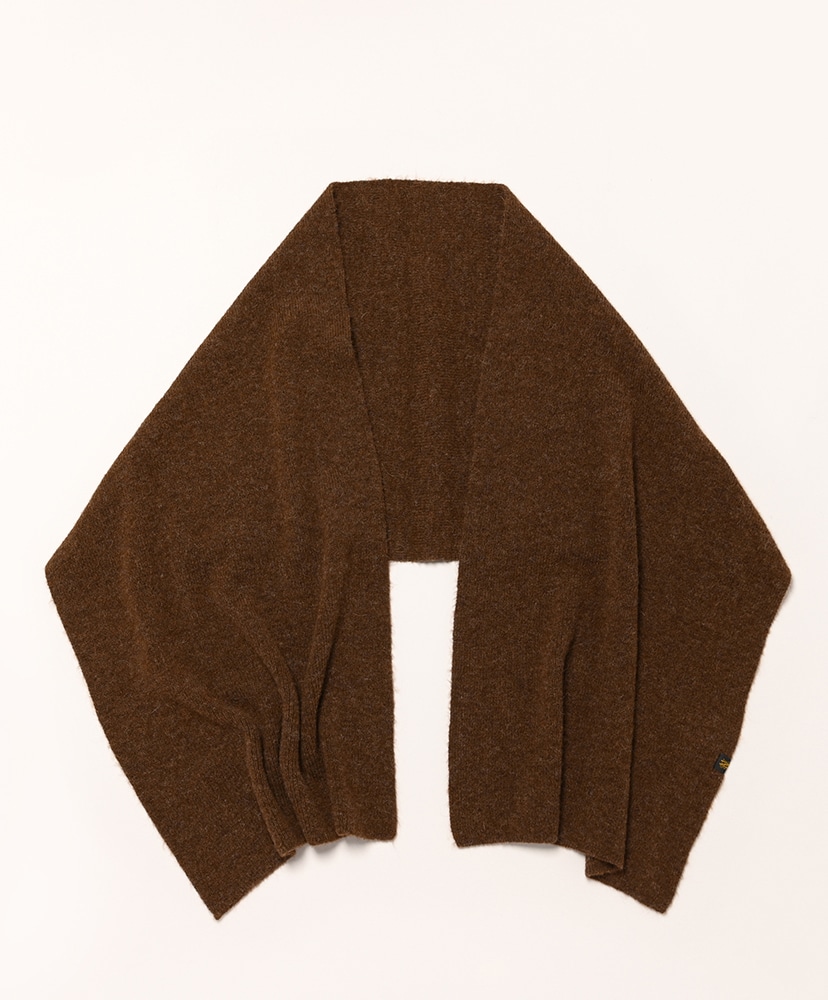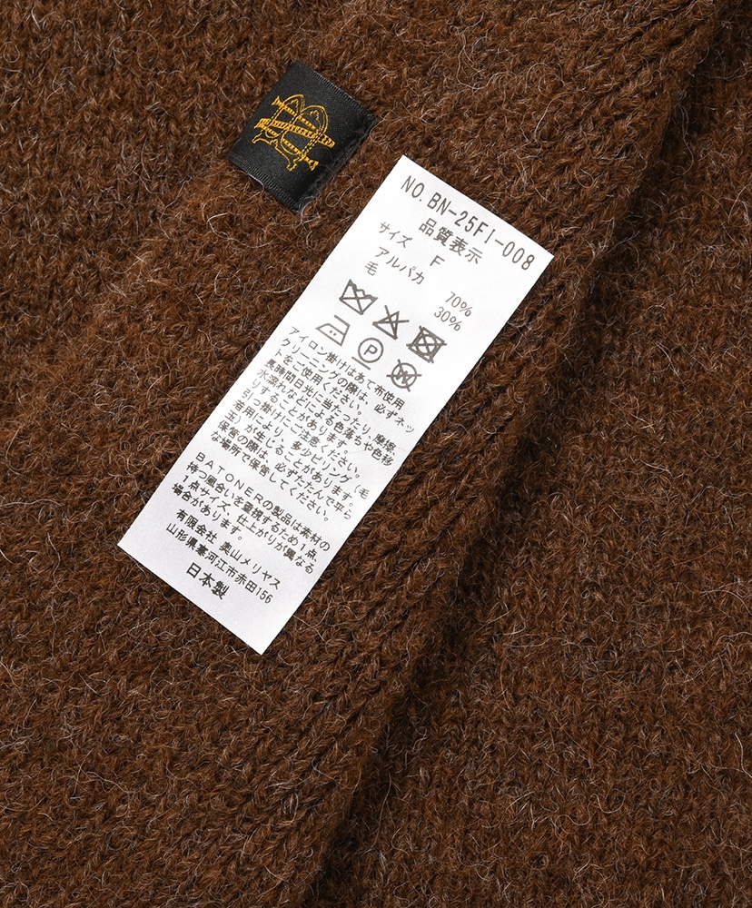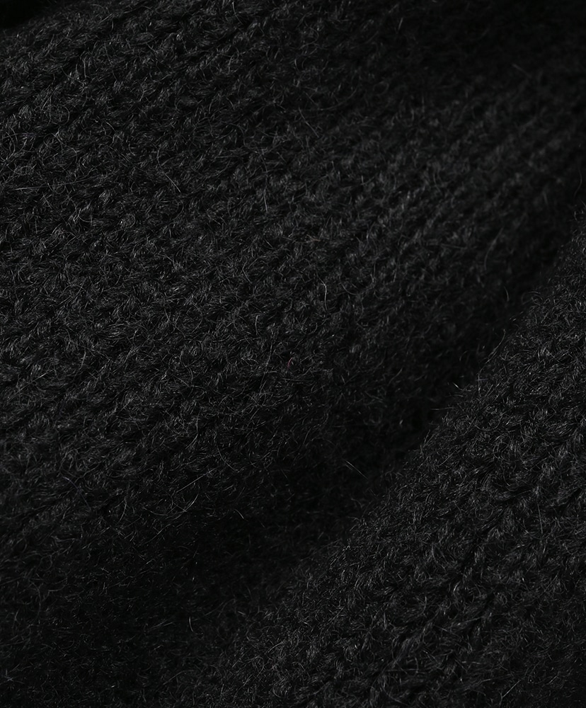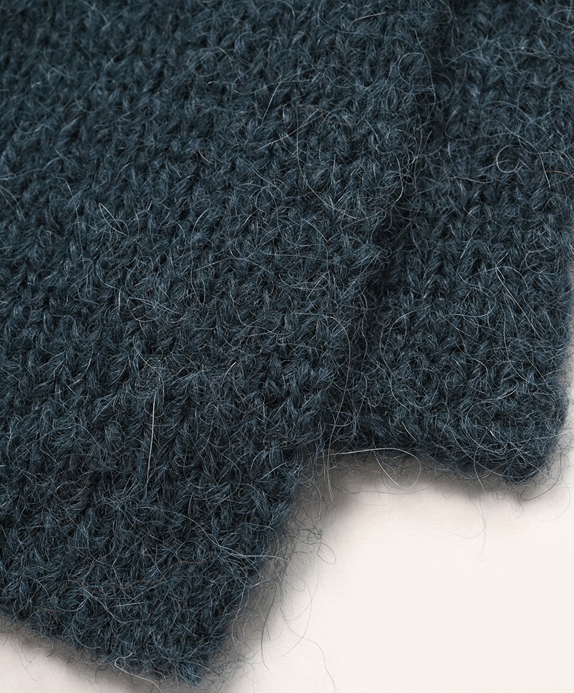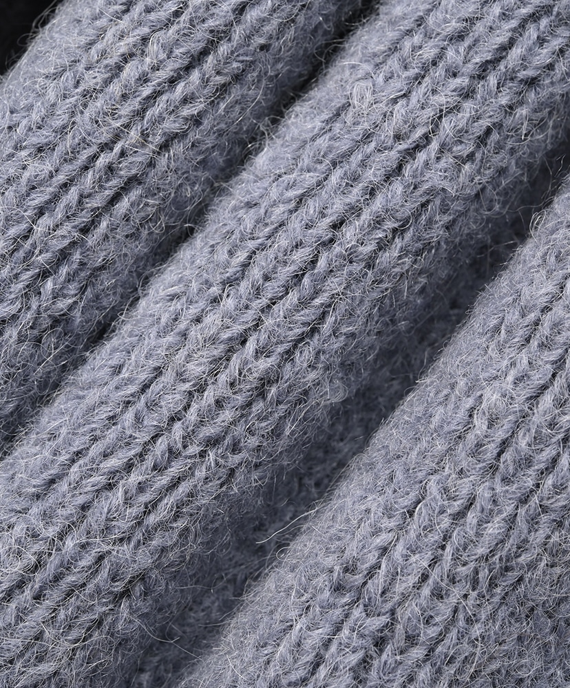 柔らかな風合いを持つファインアルパカに、メリノウールを芯にした起毛糸を多本取りし、ローゲージで編み立て。