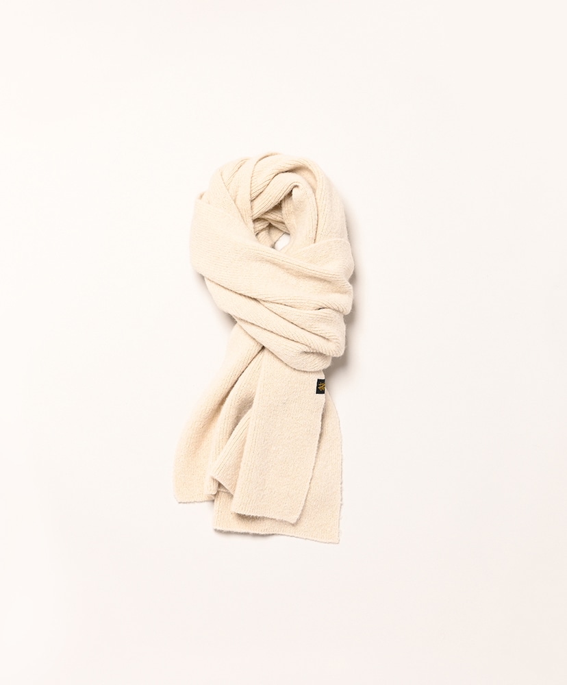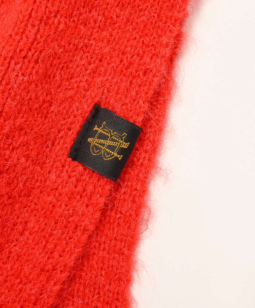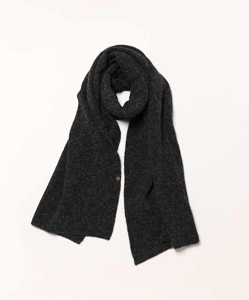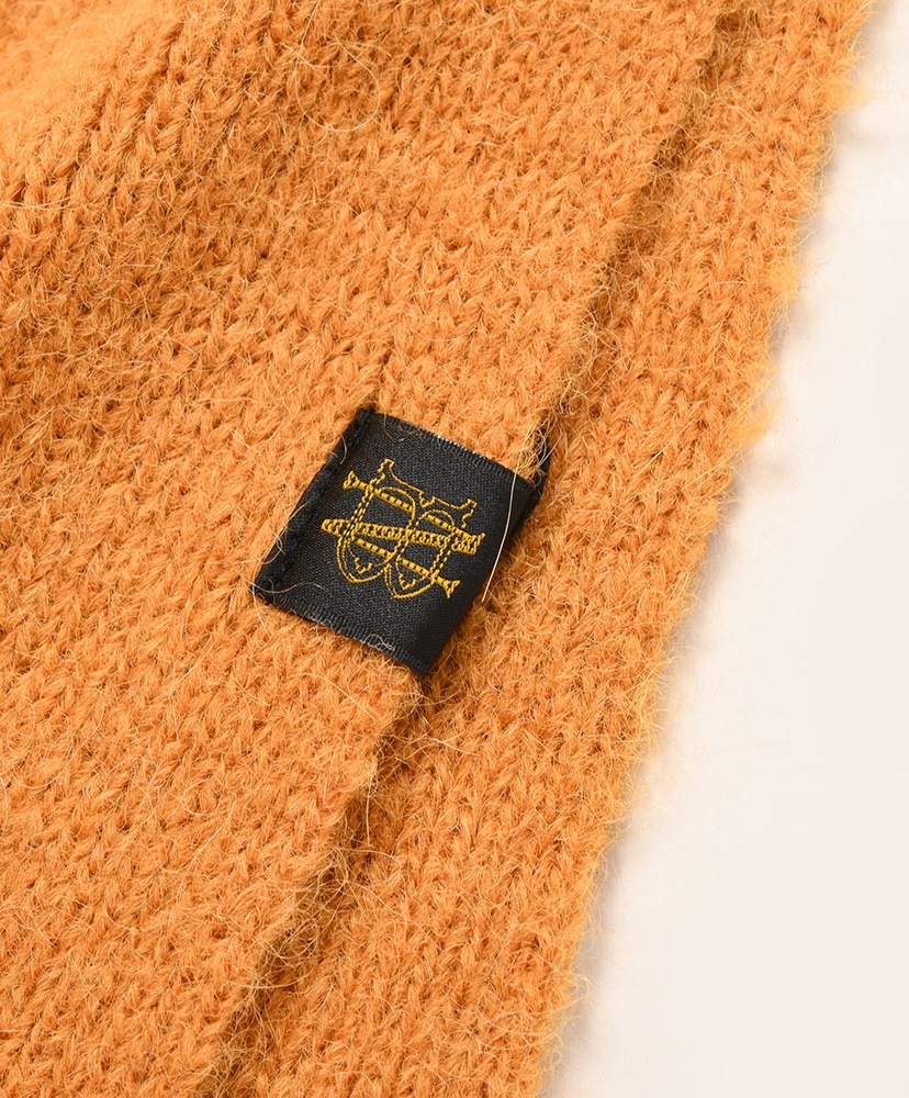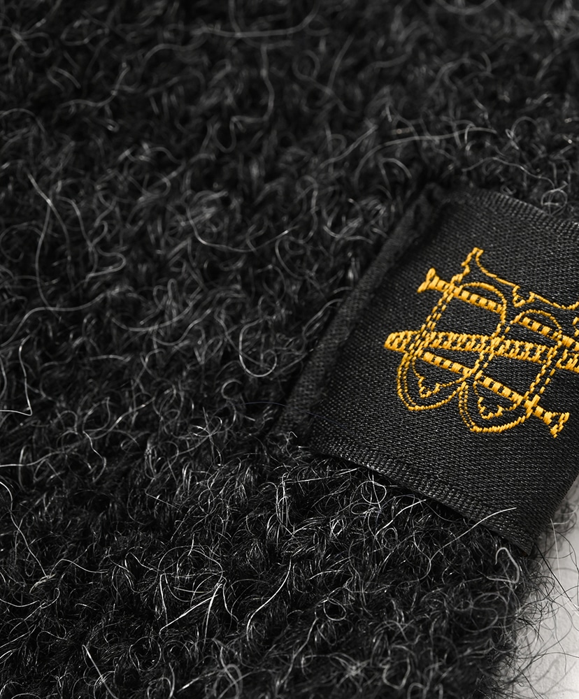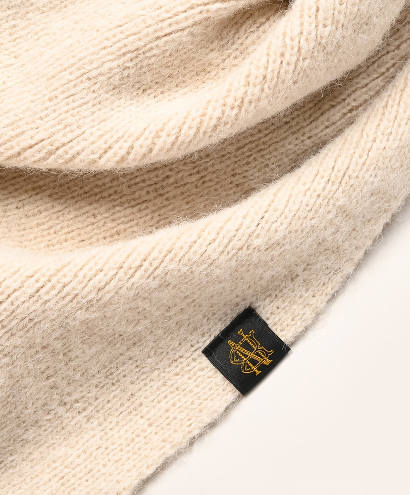 柔らかな風合いを持つファインアルパカに、メリノウールを芯にした起毛糸を多本取りし、ローゲージで編み立て。