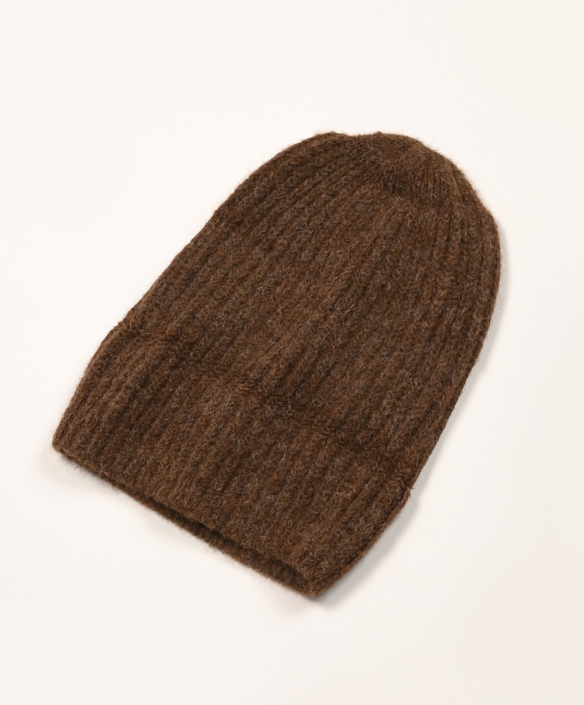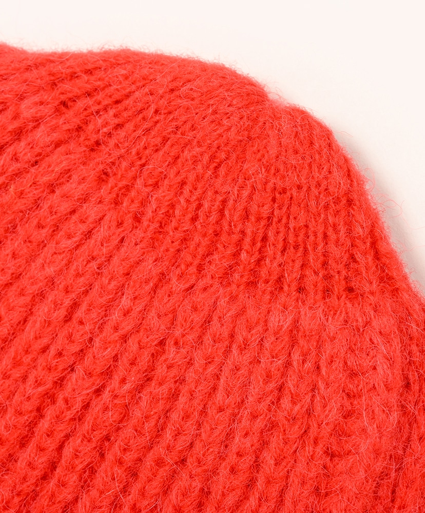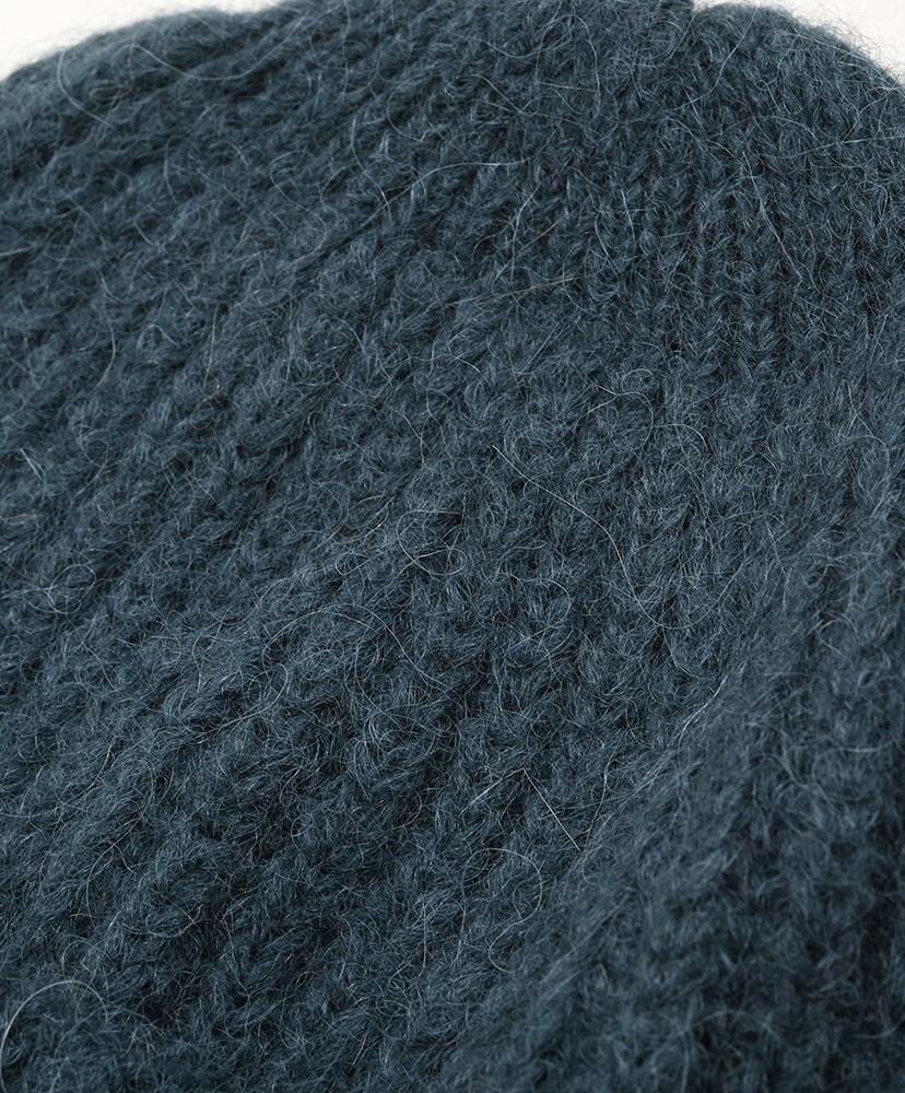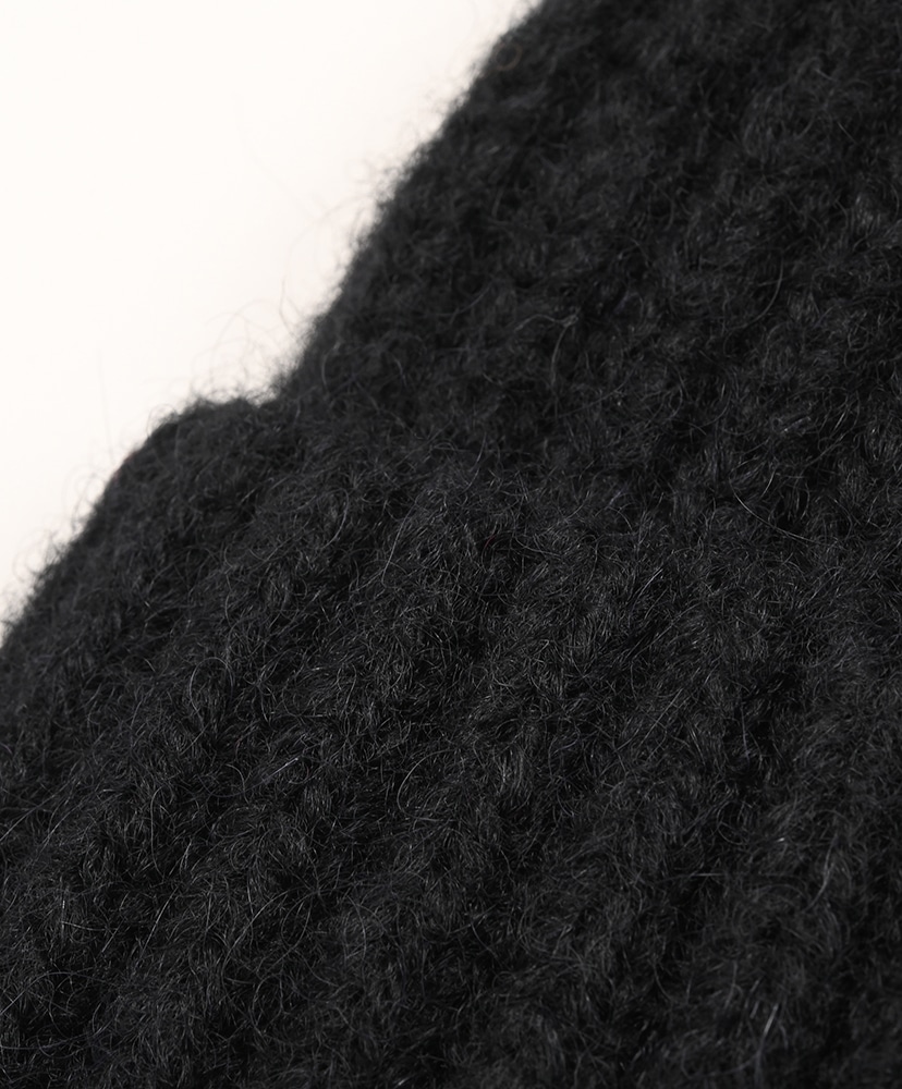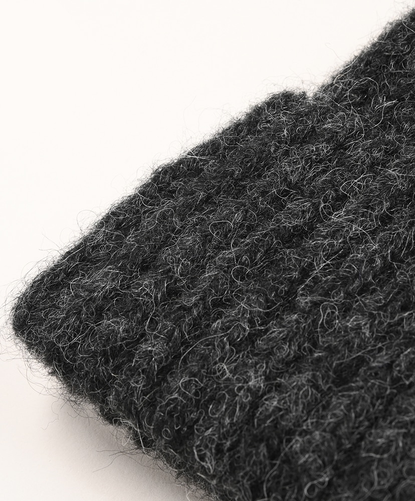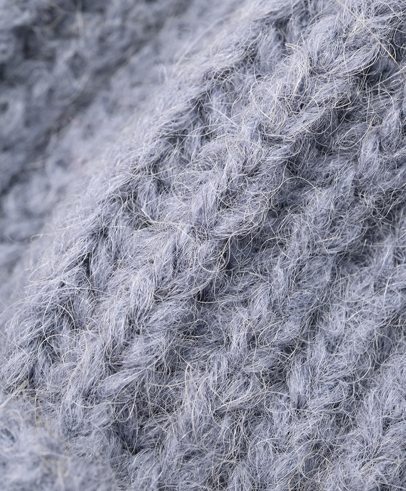 柔らかな風合いを持つファインアルパカに、メリノウールを芯にした起毛糸を多本取りし、ローゲージで編み立て。