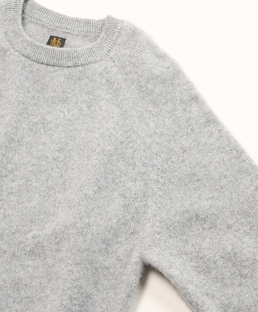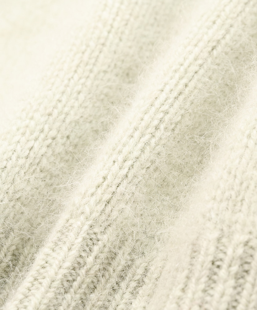 ほんのりと青味がかった薄いグレーのブルーフォックスとカシミヤ4大産地の一つアルランシャンで採取した膨らみの強いカシミヤヤギを使用し、お互いの良さを最大限に引き出す3:1の黄金比でブレンドし紡績しました。