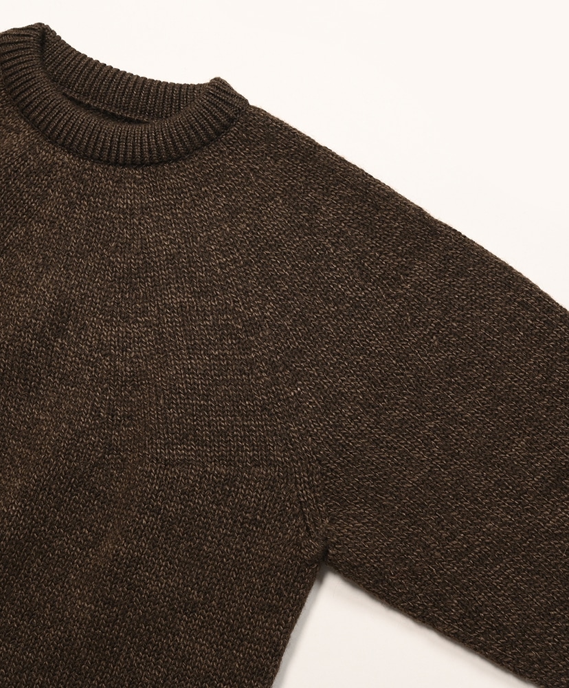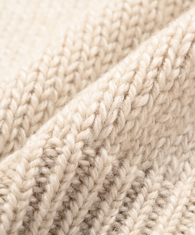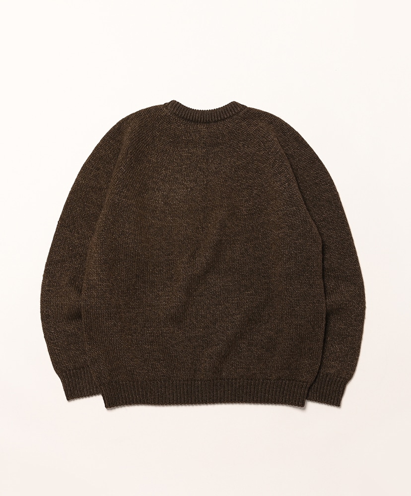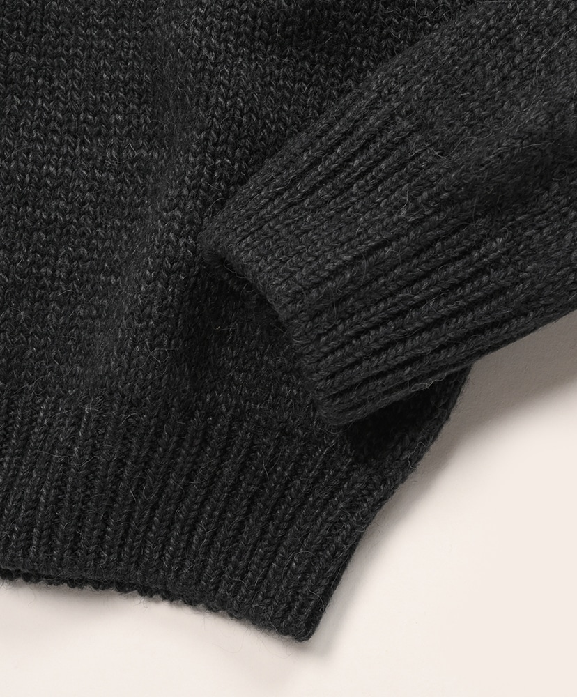 豊かなふくらみを持つメリノウールの特徴を引き出すため、ミドル番手で紡績した糸に、なめらかな肌ざわりのベビーアルパカと光沢感のあるシルクを撚糸し、深みのあるメランジカラーに仕上げた糸で編み立てました。