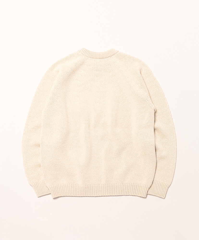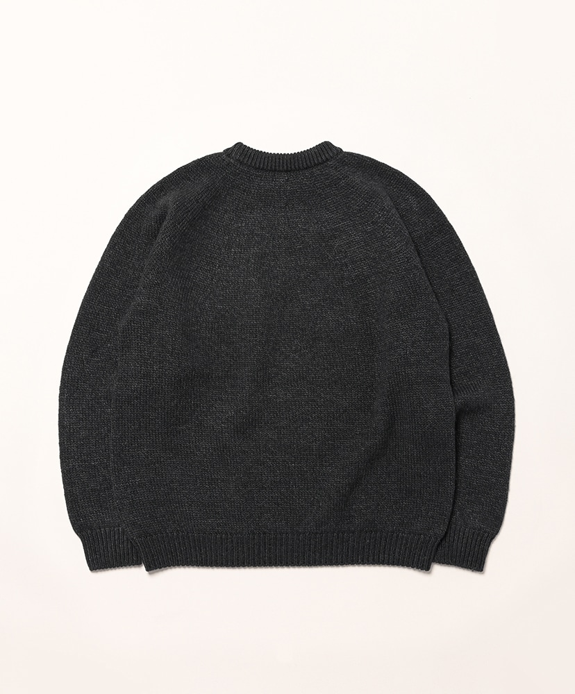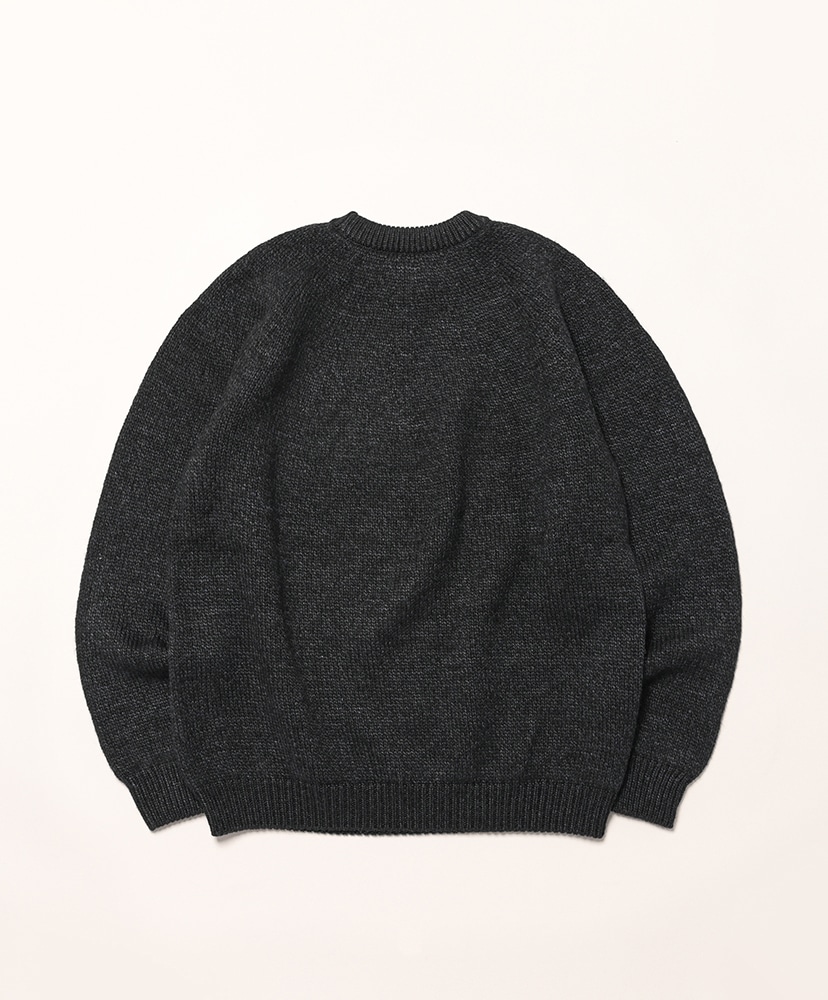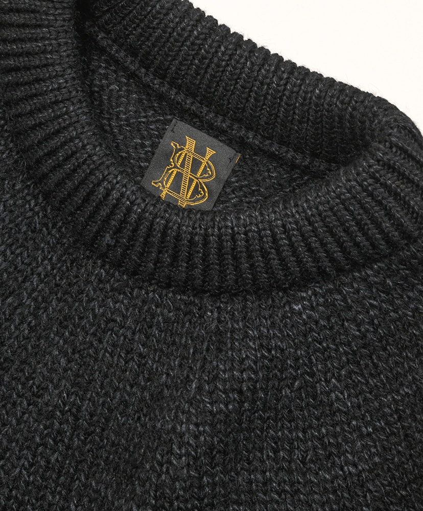 豊かなふくらみを持つメリノウールの特徴を引き出すため、ミドル番手で紡績した糸に、なめらかな肌ざわりのベビーアルパカと光沢感のあるシルクを撚糸し、深みのあるメランジカラーに仕上げた糸で編み立てました。