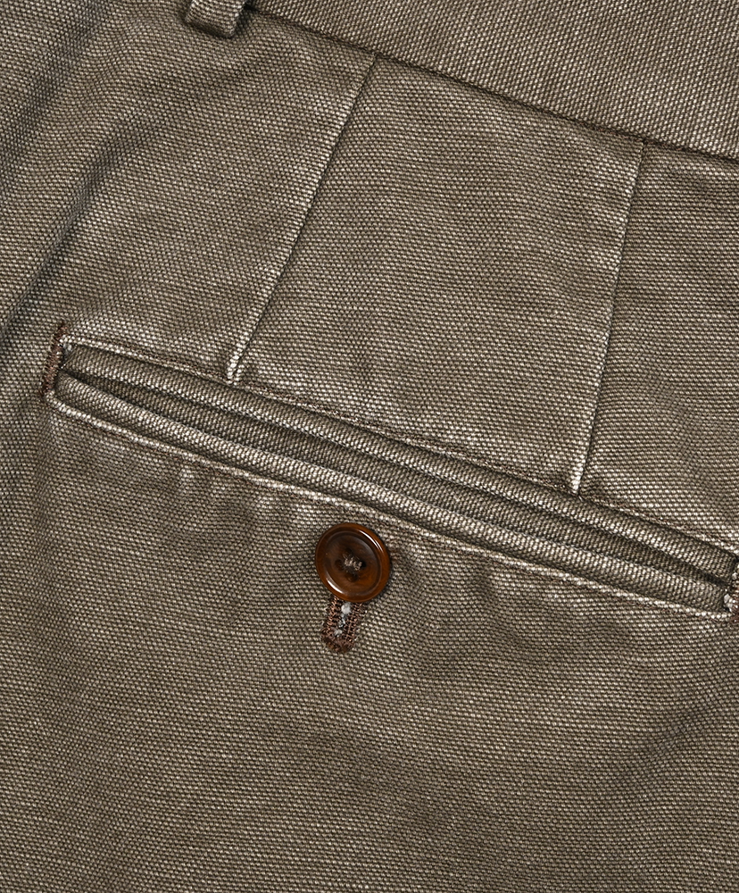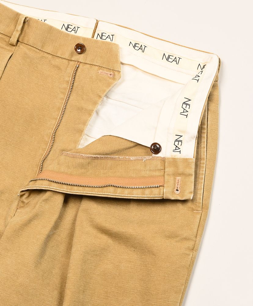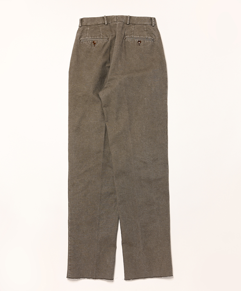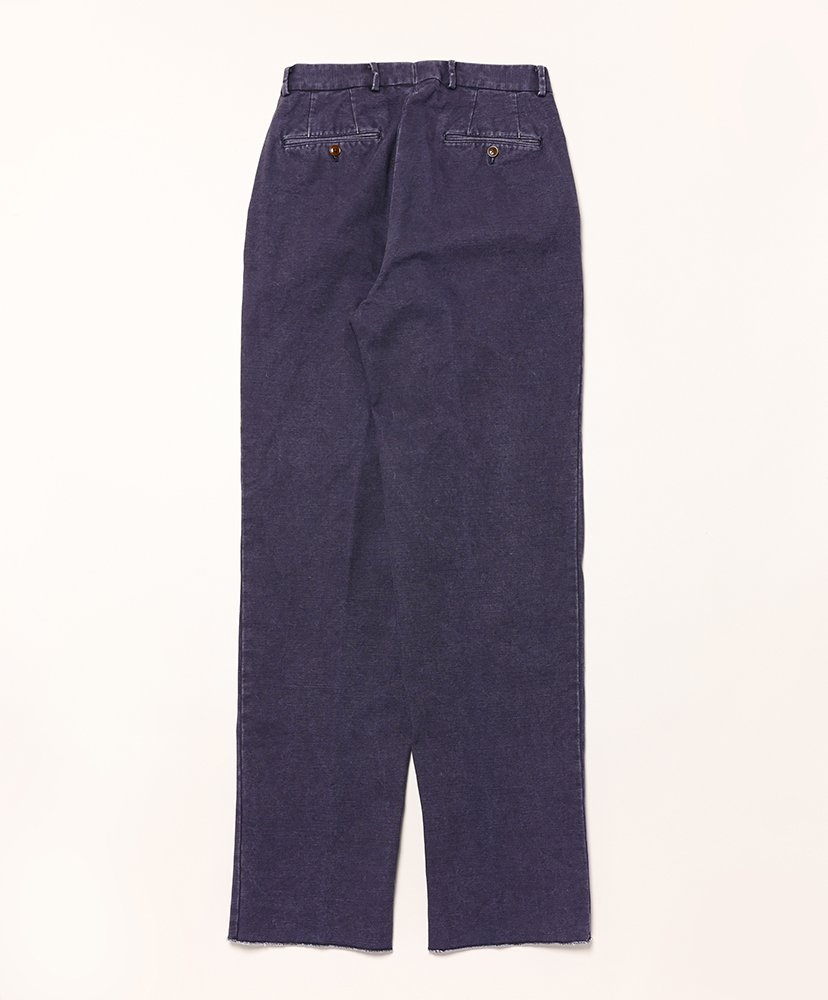 オリジナルのペインターやワークパンツの履き馴染みある生地ですが、トラウザーズに落とし込まれることにより上品な印象を与えるアウターや革靴にも相性がよろしいかと。