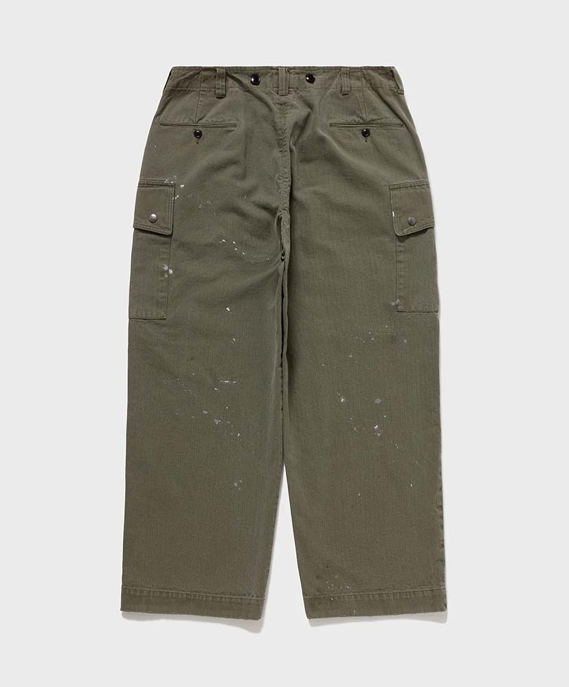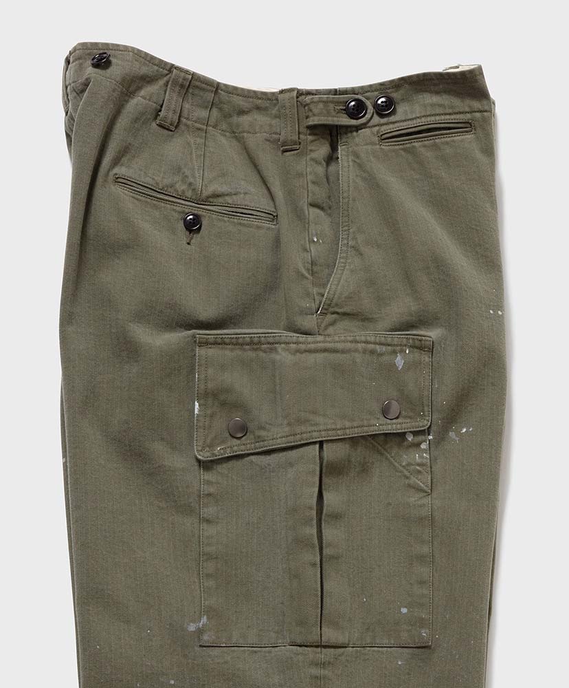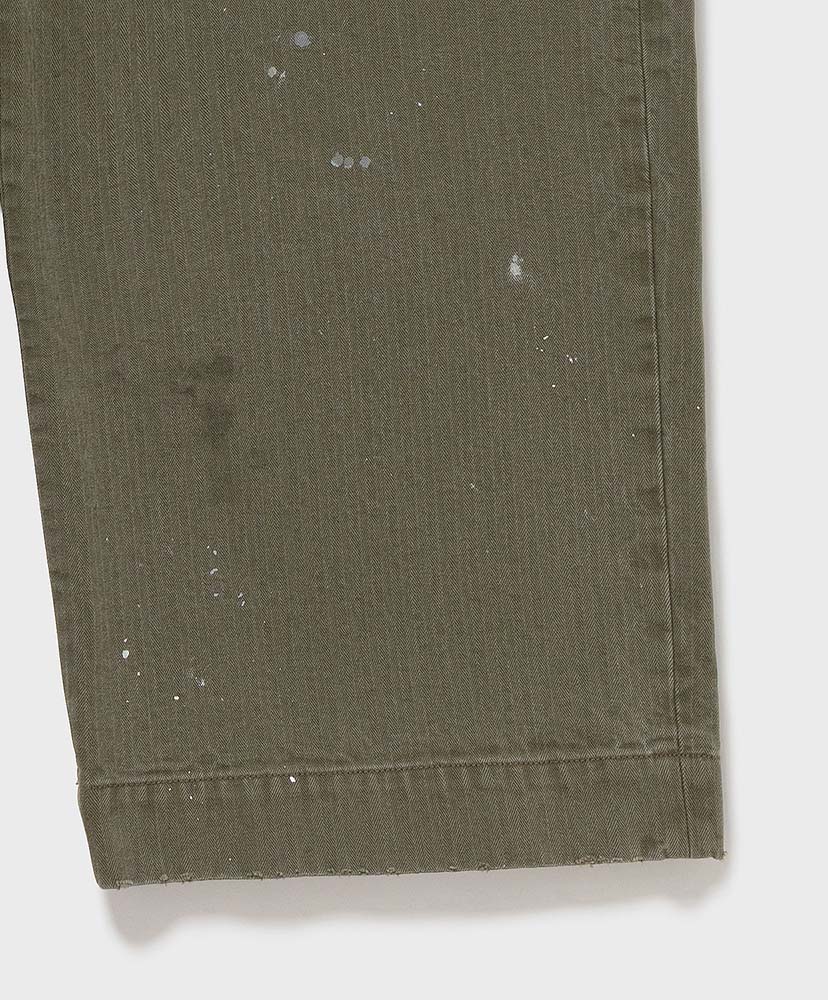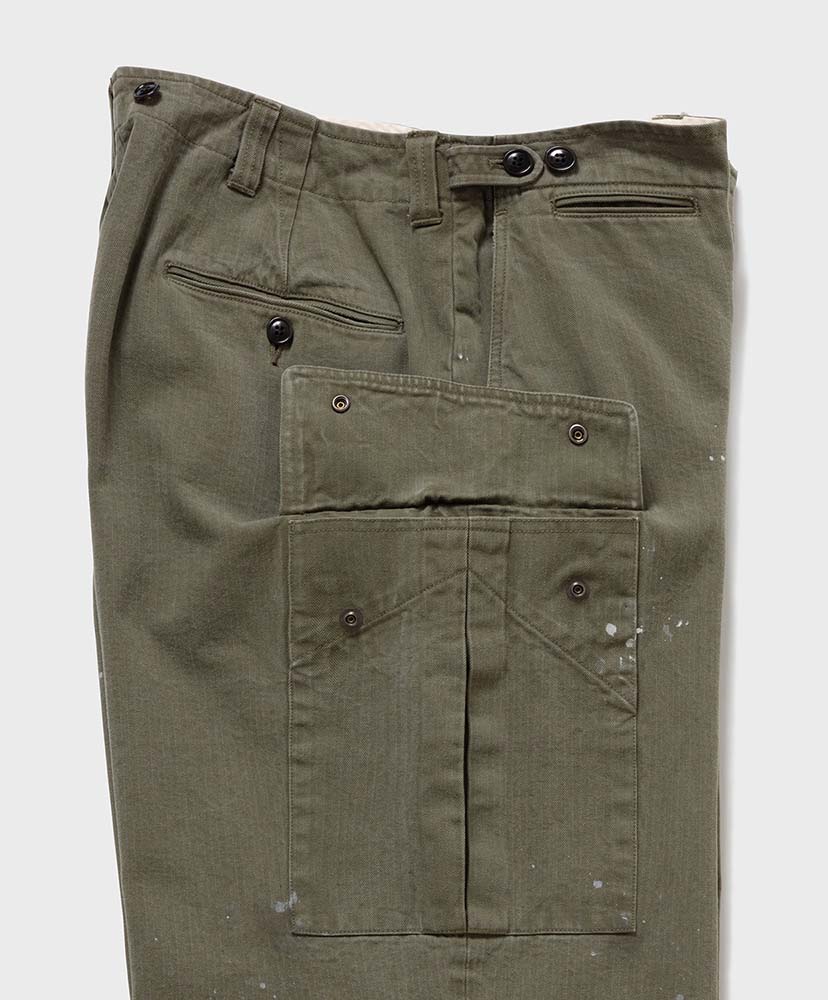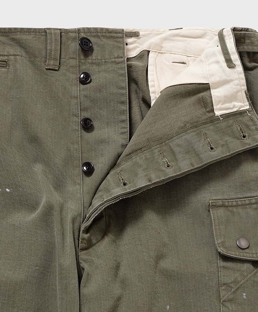 デザイン・・・米軍41チノにマチの無いサイドポケットをつけ、短丈アウターとのコーディネイト時にシルエットをキープしながらワーク、ミリタリー味をプラスできるデザイン。腰回りはもたつかずスッキリフィットいたします。こちらも岡山・豊和での10年着用加工プラスペンキ、グリス汚れ加工を施しております。