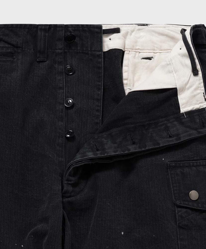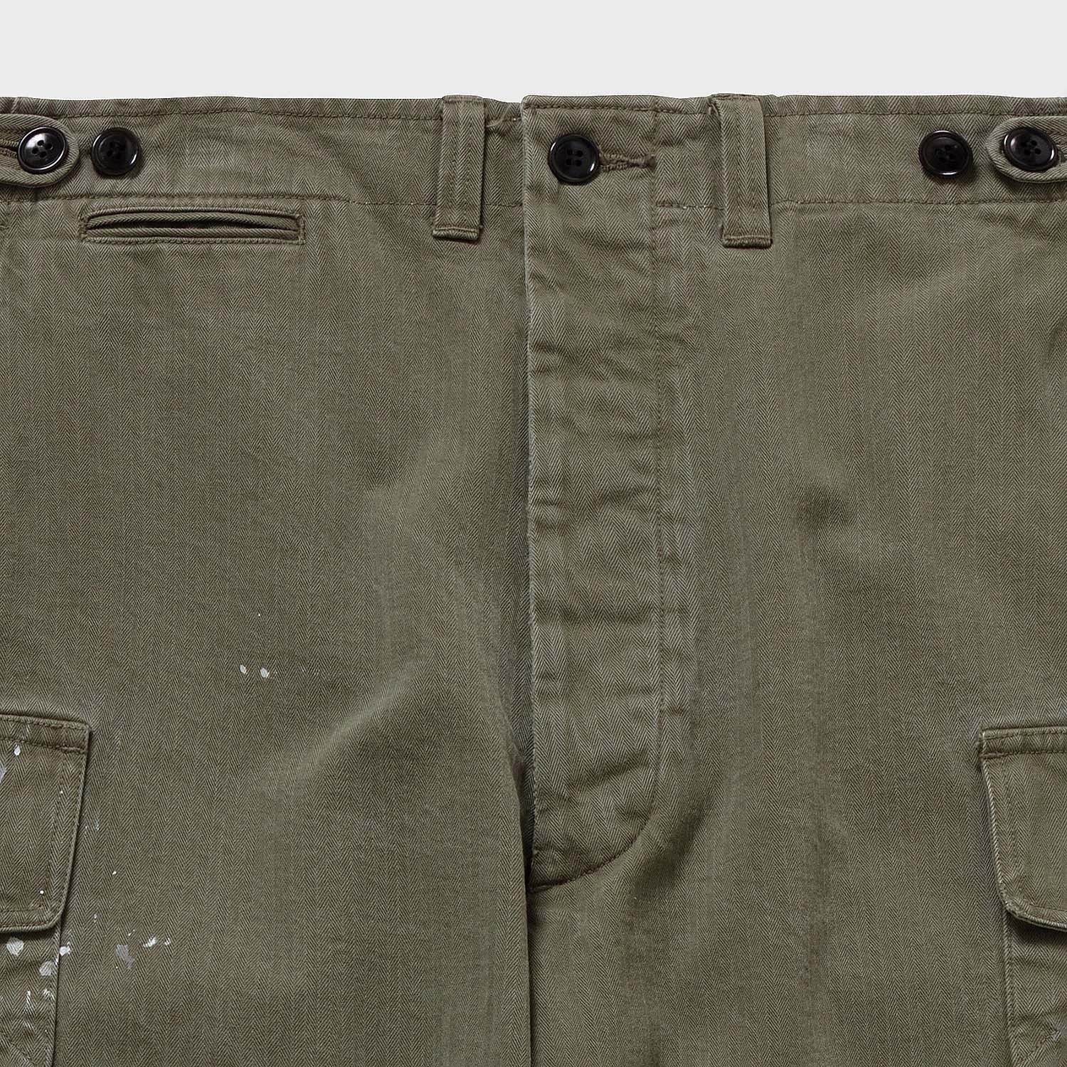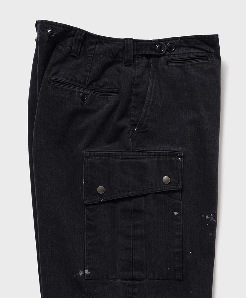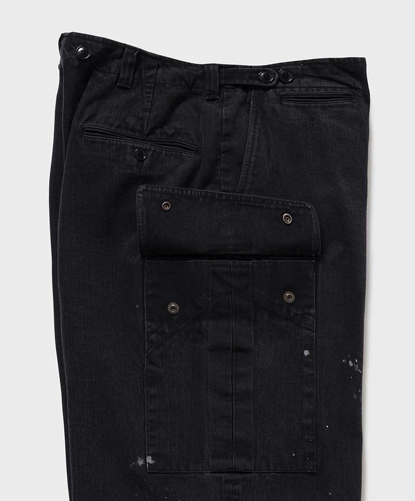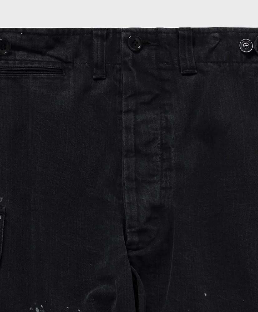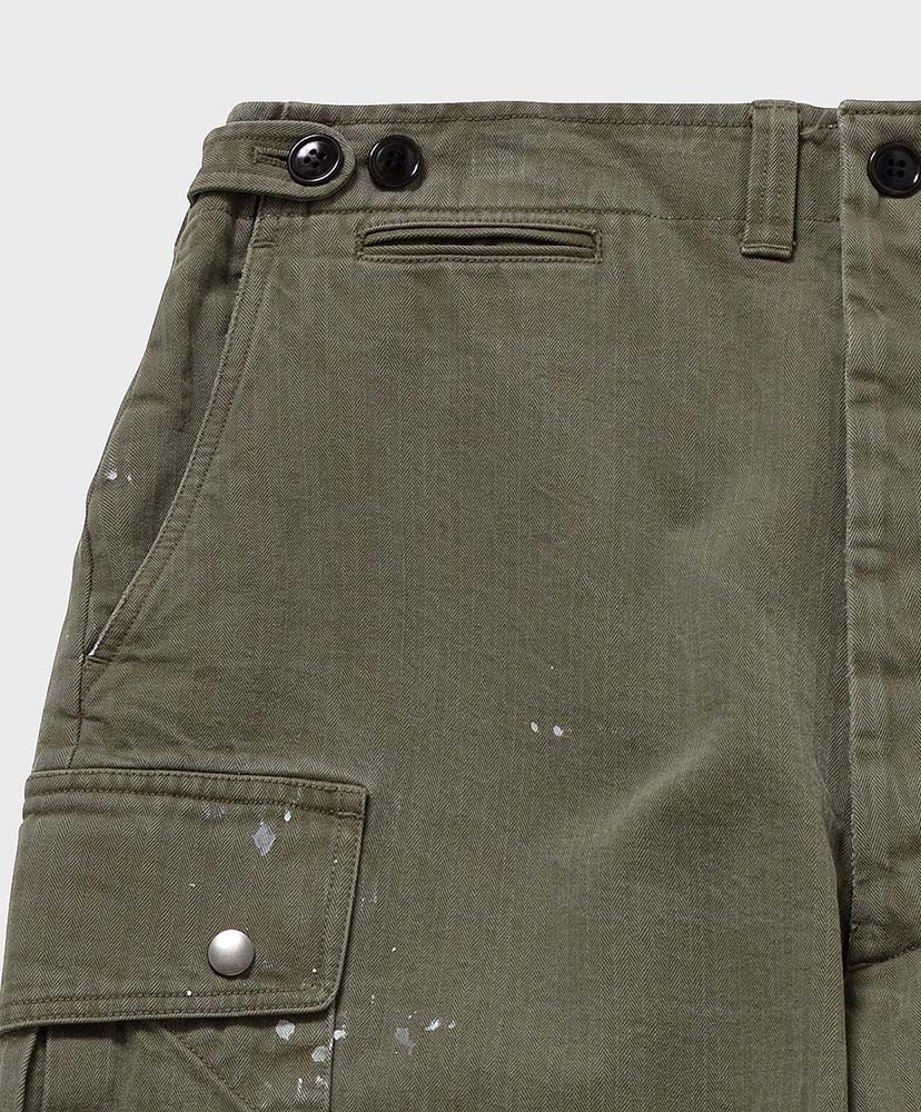 デザイン・・・米軍41チノにマチの無いサイドポケットをつけ、短丈アウターとのコーディネイト時にシルエットをキープしながらワーク、ミリタリー味をプラスできるデザイン。腰回りはもたつかずスッキリフィットいたします。こちらも岡山・豊和での10年着用加工プラスペンキ、グリス汚れ加工を施しております。