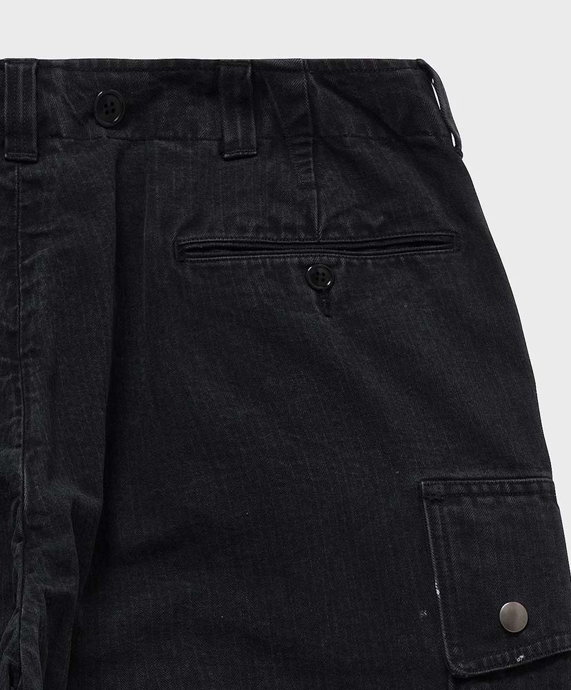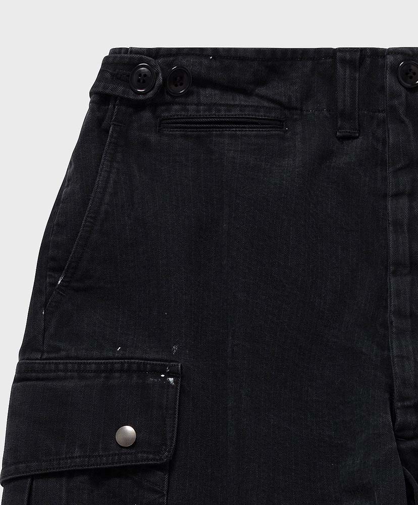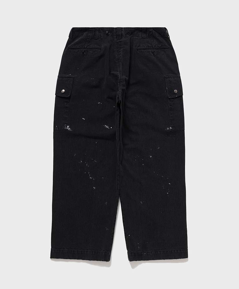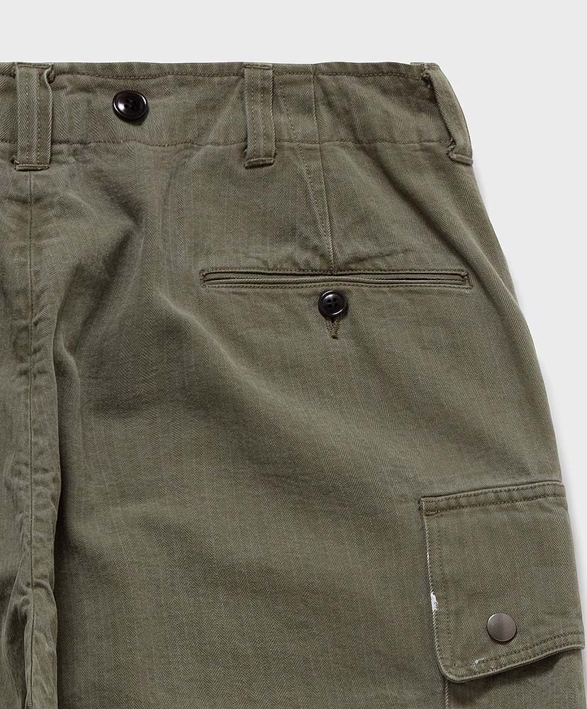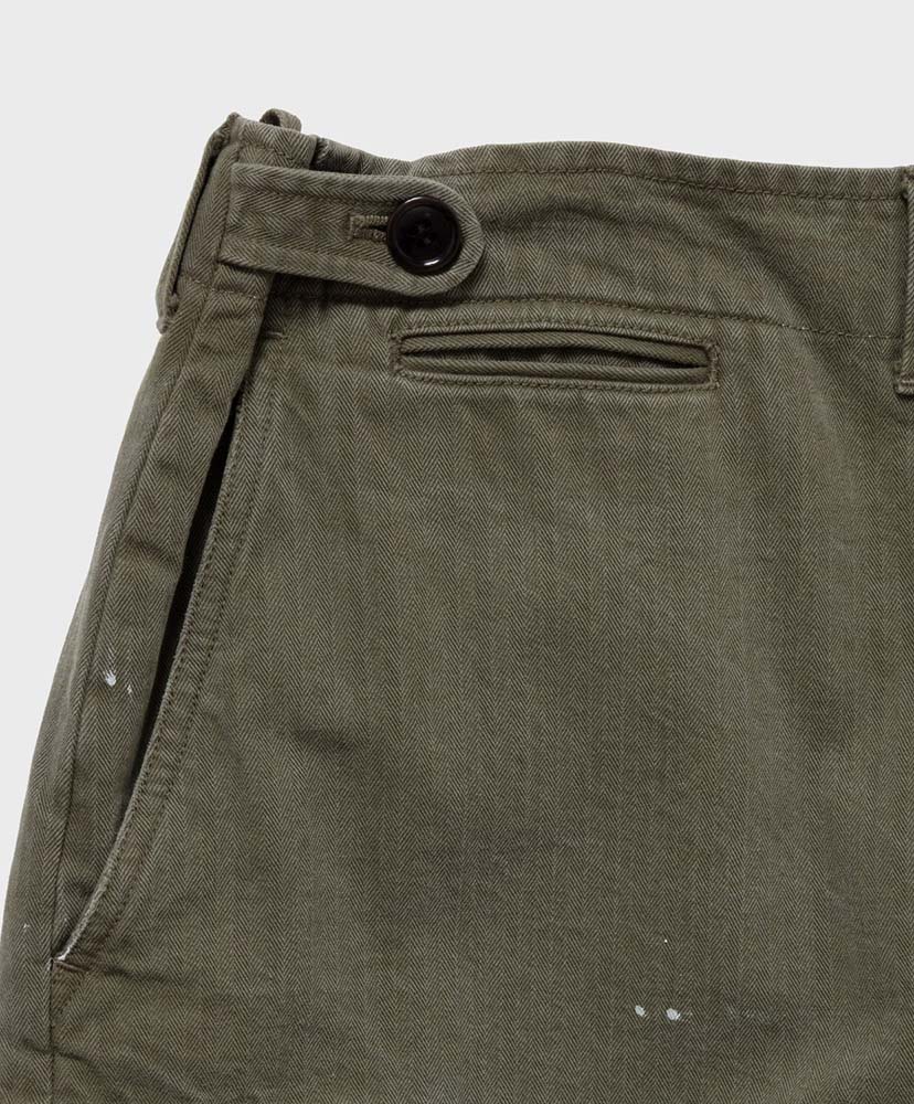 デザイン・・・米軍41チノにマチの無いサイドポケットをつけ、短丈アウターとのコーディネイト時にシルエットをキープしながらワーク、ミリタリー味をプラスできるデザイン。腰回りはもたつかずスッキリフィットいたします。こちらも岡山・豊和での10年着用加工プラスペンキ、グリス汚れ加工を施しております。
