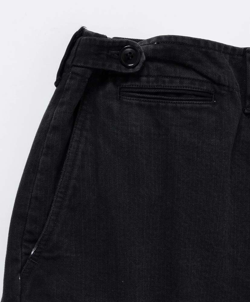 テキスタイル・・・1940年代のアメリカ軍OG107の前身となるコットンヘリンボン素材の再現です。当時も硫化染料で生地染めされており、独特の艶消しな枯れた表情へと進んでいく。この素材感はブリティッシュワークウエアのヴィンテージでも多々見受けられる。ヴィンテージワークウエアの教科書的素材です。