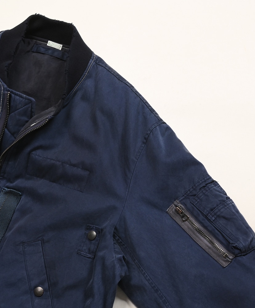 胸テープが 外された跡としてステッチだけ残っていて、左袖にはリペア跡として生地の切り替えがある