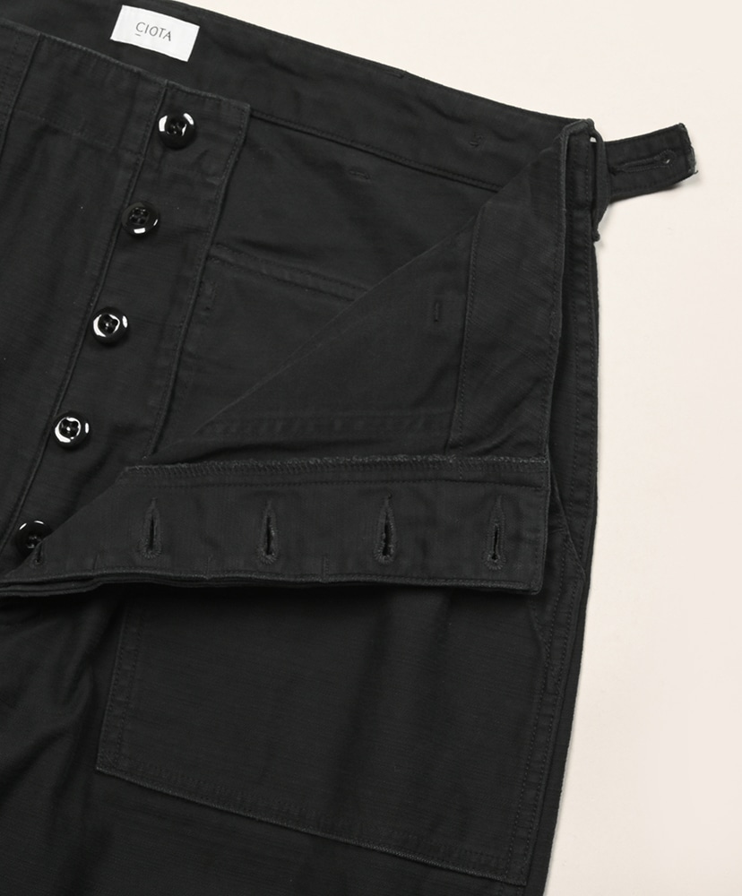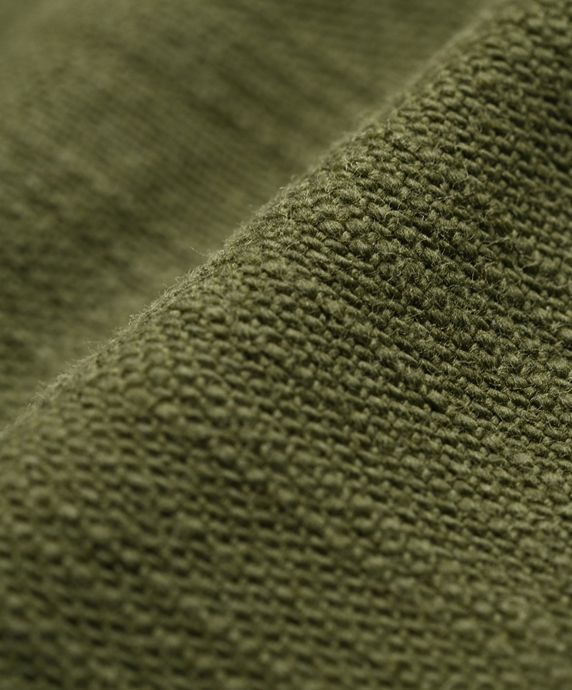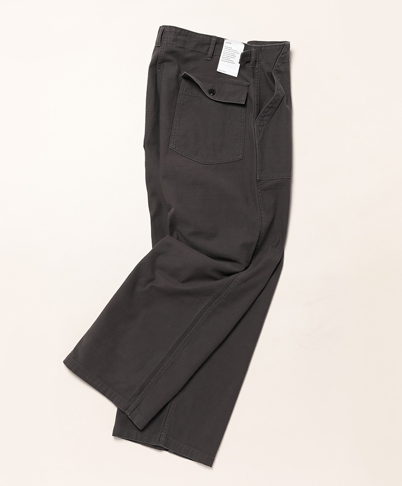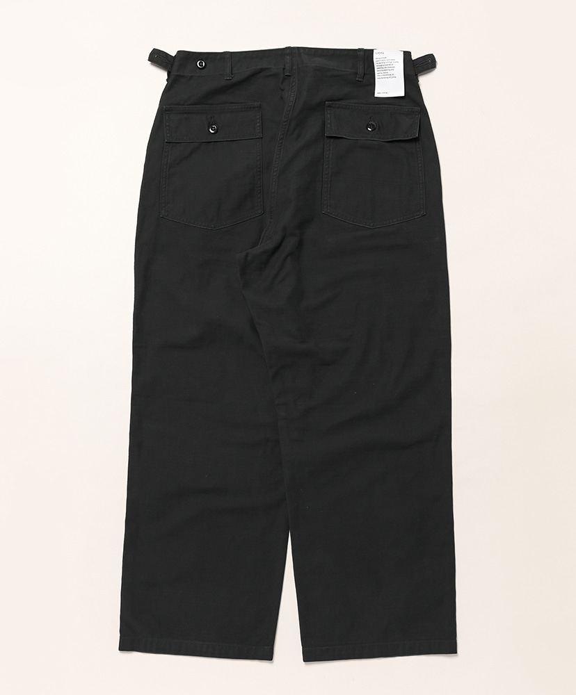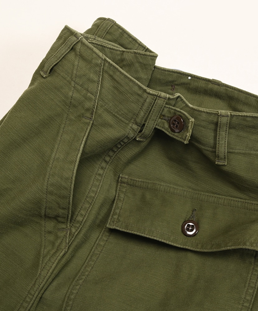 古着の米軍ベイカーパンツを分析し、綿花の最高峰とされるSUVIN COTTONで再現したムラ糸バックサテンを採用。裏面は光沢を持つ朱子織(サテン組織)で、肌あたりが滑らか。表面はムラ糸特有のザラつきがあり、穿き込むほどに深みを増す経年変化を楽しめます。耐久性にも優れ、長く愛用できる素材です。