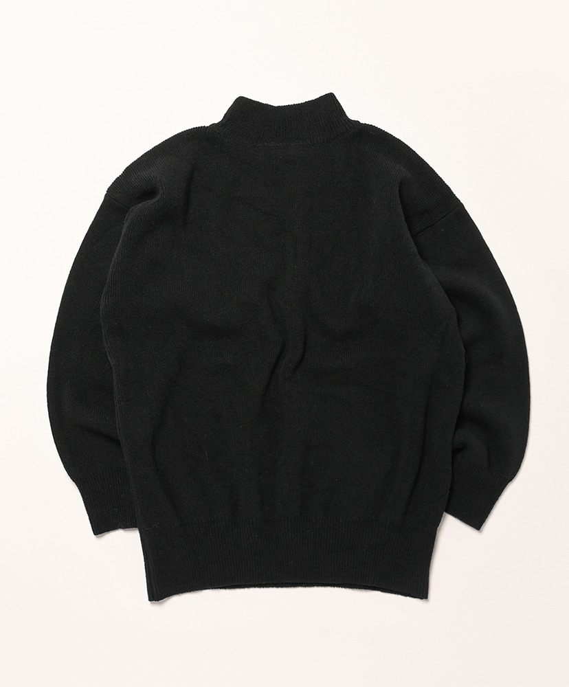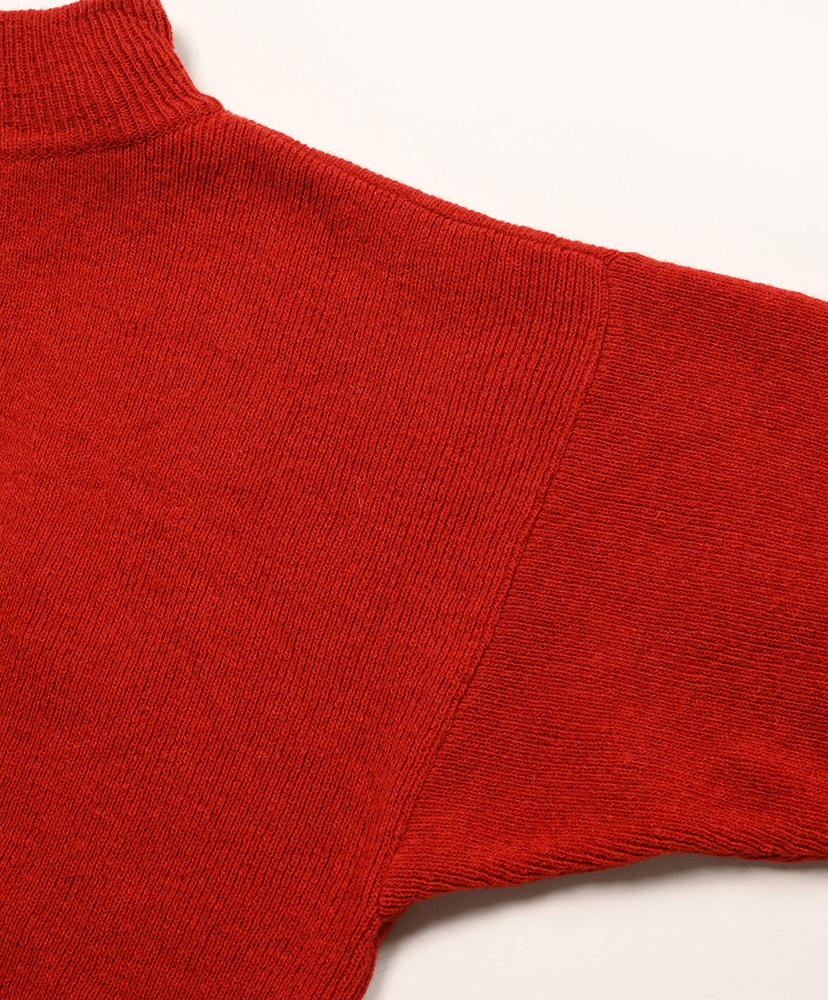 ゴリっとしたタッチ、ミリタリーセーターのような素材感をイメージして制作しているが、硬さや張り感は生かしながらも、動きやすく、身体に馴染むようにゴム編み組織にしている。糸が丈夫な上、目を詰めたゴム地で編んでいるのでキックバック もよく、家庭洗濯をしても型崩れしにくい。希少な日本国内での手横編みで制作している。
