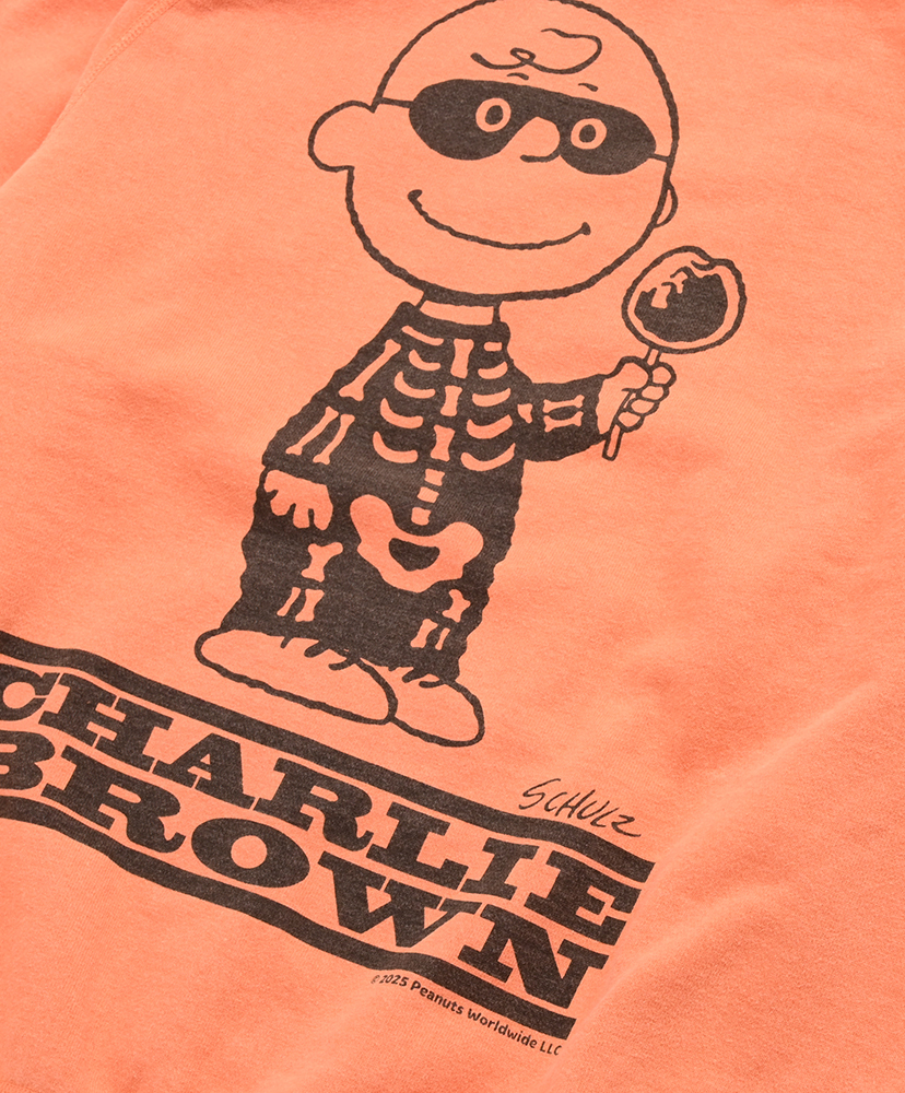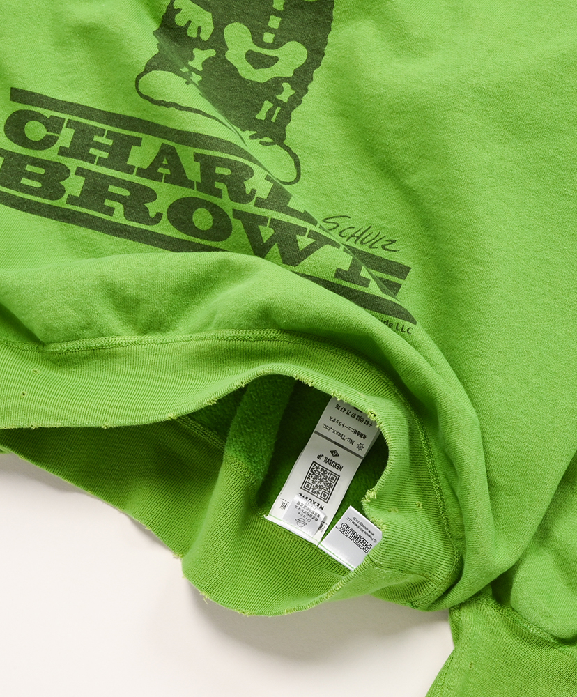 USAコットンのオリジナル丸胴裏毛生地を使用し、ヴィンテージのBEETHOVENやSNOOPYシリーズのボディになっているSPRUCE社製のスウェットの縫製方法を踏襲し、ヴィンテージのスヌーピーシリーズでは展開されなかった珍しいチャーリーブラウンをフィーチャーしました。
