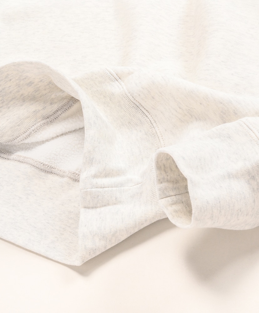 素材は、表面は甘撚りコットン、裏面にはポリエステル糸を使用しボアフリース起毛仕上げをすることで見た目は普通のスウェットながらも非常にソフトで膨らみがあり、尚且つ保温性に優れたブランドオリジナルファブリック〈FleeSweat(フリースウェット)〉を使用。