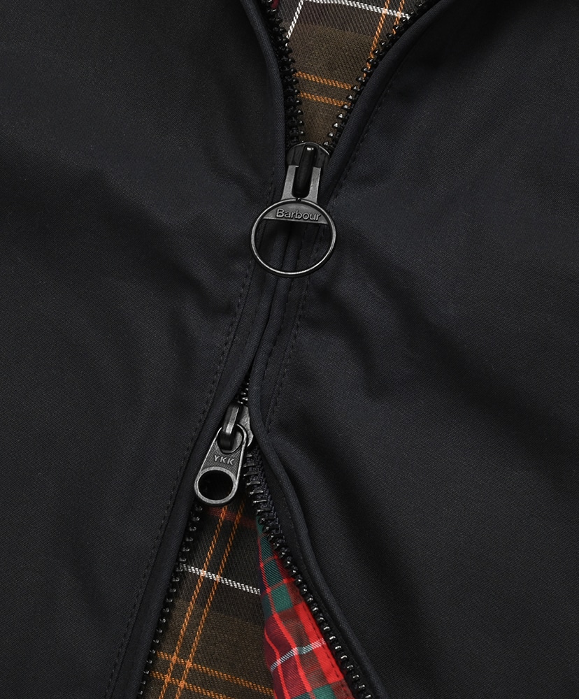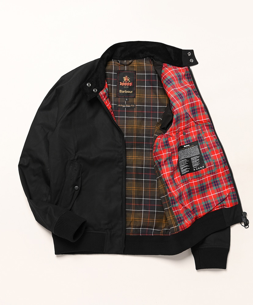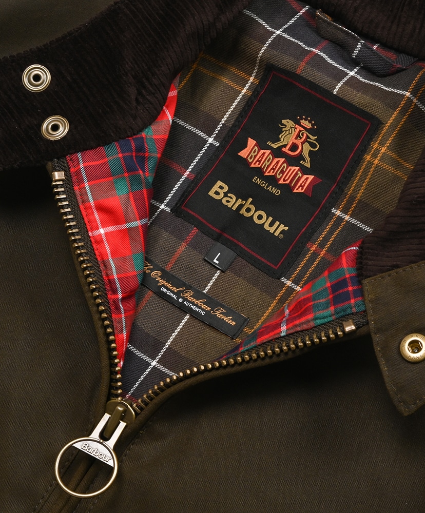 裏地にはBarbourクラシックタータンとBarracutaフレイザータータンを組み合わせたミックスライニングを使用し、見えない部分にもこだわりを感じさせるデザイン。