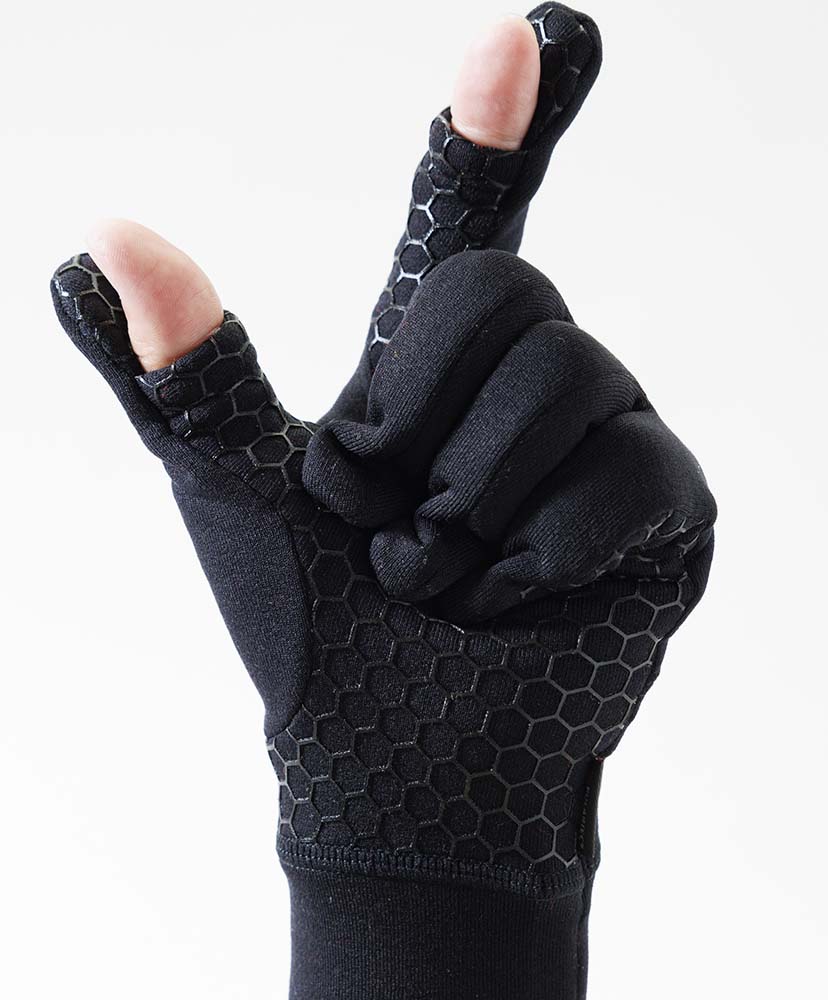 掌には滑り止めプリントを施し、指先は指出し仕様に設計。スマートフォン操作や細かい作業など、さまざまなシーンでの操作性を確保しています。