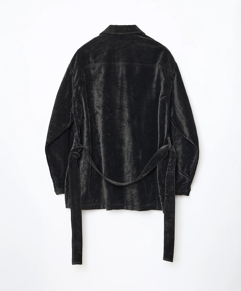 A single-layer coverall tailored from cotton velvet, dyed using a traditional sumi ink technique.