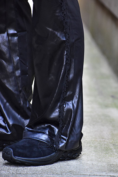 まず素材と大胆な素材使いに目が入ってしまうのですが、そして今となれば珍しくないアイテムかもしれませんが、自分としては「ブーツカットのジャージ!?」というだけで衝撃的で「しかもフリンジ付き!?」と思ってしまうのですが、これがNEEDLESが創造した新ジャンルのだと痛感しました。