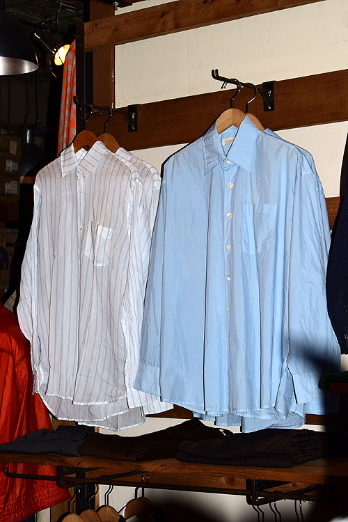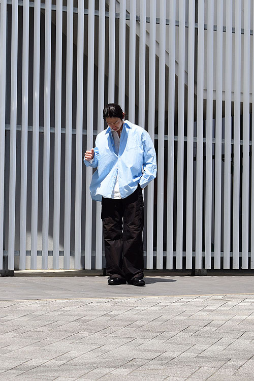コットン×ポリアミドの生地に後染を施し、薄くハリ感を持ちながらくすんだ色彩の奥行きがあるシャツやカーゴパンツ。