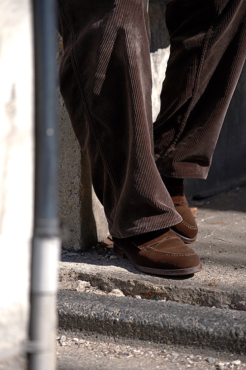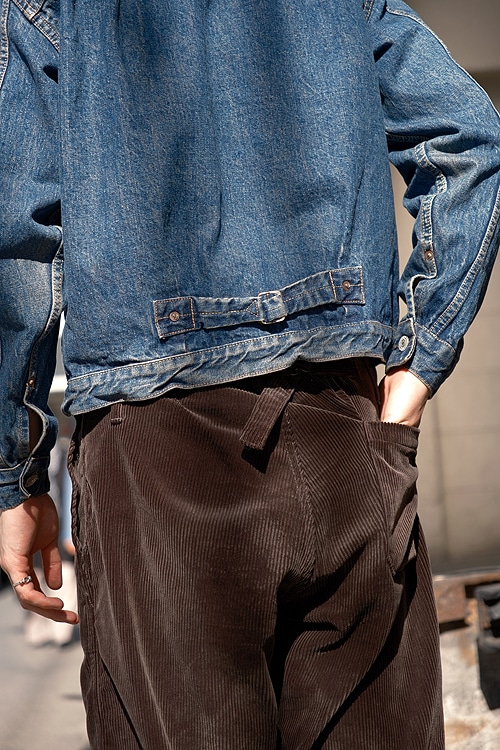 また、本来コーデュロイには向いてない染色方法を施し、均一に染まらずムラが出てしまうことを逆手に取り、足を通す前からすでにヴィンテージのような迫力です。