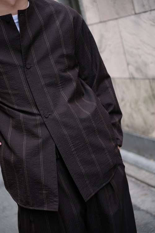 そして一見単色の濃色に見えるストライプは黒と深いブラウンで構成されています。シアサッカーの畝により細いストライプが揺らいで見えるので、単なるストライプ柄ではなく単体で奥行きを表現することが出来ます。整理加工でこの畝と揺らぎが損なわれないように自然な仕上げがなされているのもポイントです。