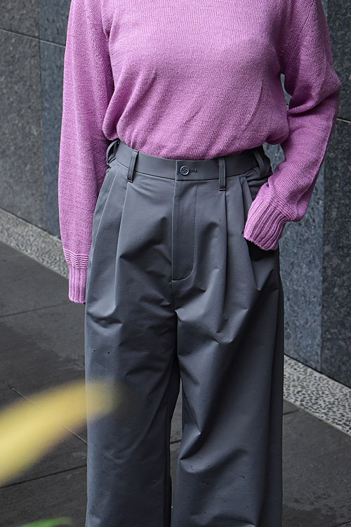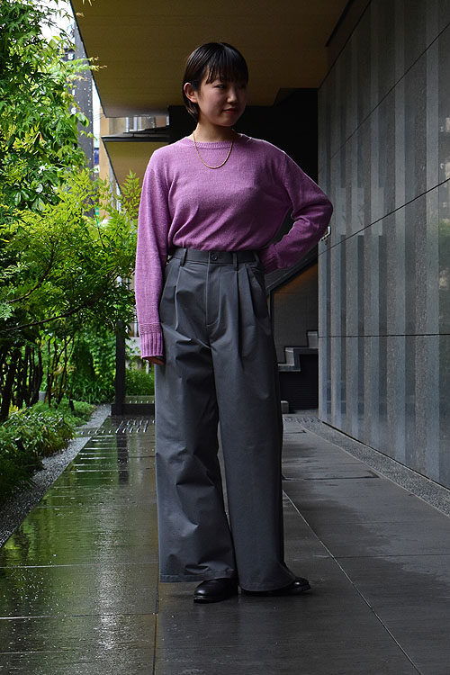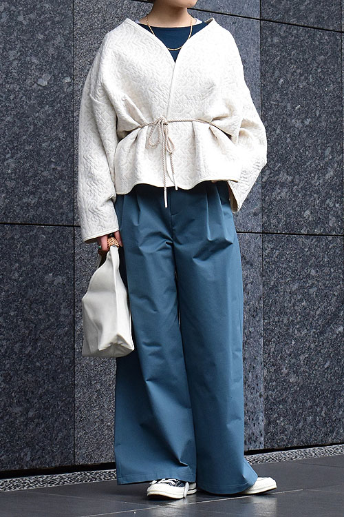 ”ジャージ”ということですが、綺麗なワイドシルエットのパンツ、という印象だったのでアイテム名を見て驚きました。写真とアイテム名だけだとわかりづらいかもしれないのですが、きっちりしたスタイリングにも全く問題なく馴染む楽なパンツ、と思っていただければ良いと思います。