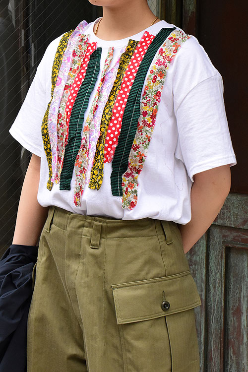 ルーズサイズのTシャツに、マルチカラーのフリルをつけたリメイクTシャツ。