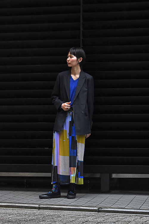 スカートやワンピースなど、女性らしい印象のあるアイテムとの合わせも良いバランスにまとまるのではないでしょうか。
