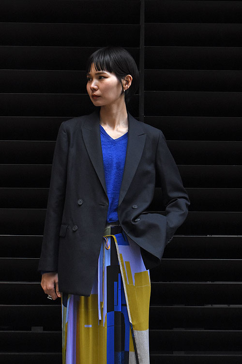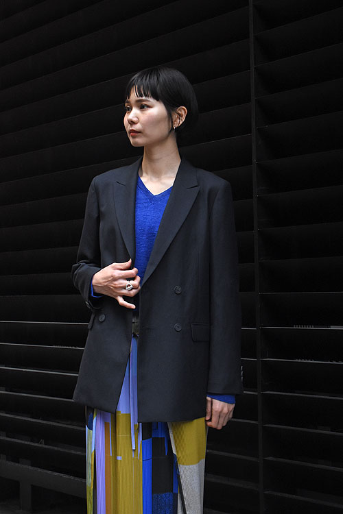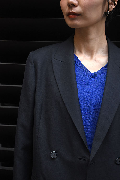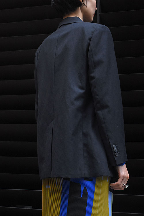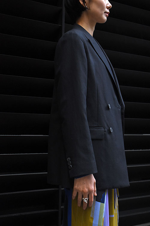 ピークドラペルのダブルブレストジャケットという比較的フォーマルな印象の強いアイテムですが、ボックスシルエットで、後ろ見頃の脇は少し体に沿わせることで女性らしさを持たせており、単体でもスタイリング組んで頂き易いジャケットに。
