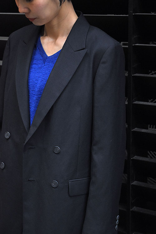 岐阜県羽島市にて織りあげられた、ウールとリネンによる交織素材で仕立てたダブルブレストジャケット。