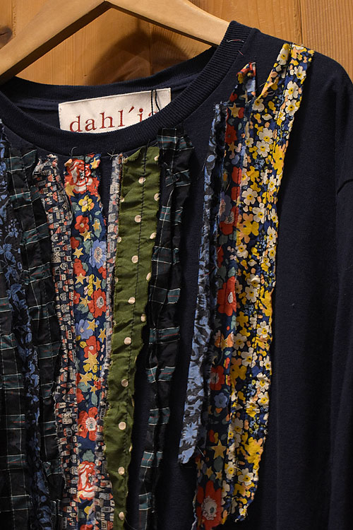 メンズサイズのゆったりしたカットソーにヴィンテージ生地をフリル調にあしらったガーリーなデザインです。
