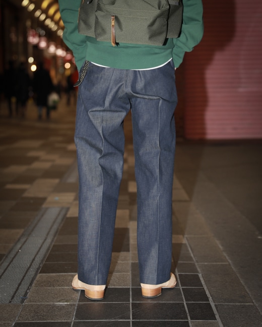 現代的な解釈で仕上げたミリタリースラックス。未加工のライトオンスデニムを使用し、ドレススタイルのデニムパンツとして表現した一本。