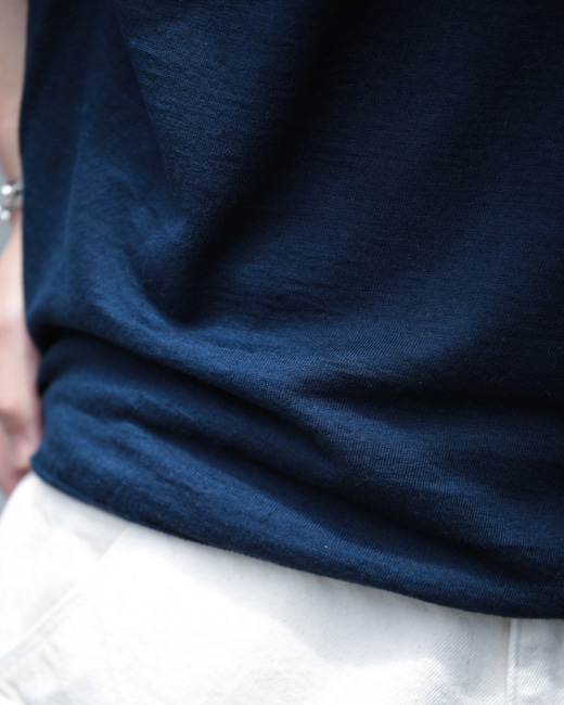 ゆとりを持った身幅とやや強めのリブとのバランスがシルエットのアクセントとなり、非常に魅力的な一枚です。