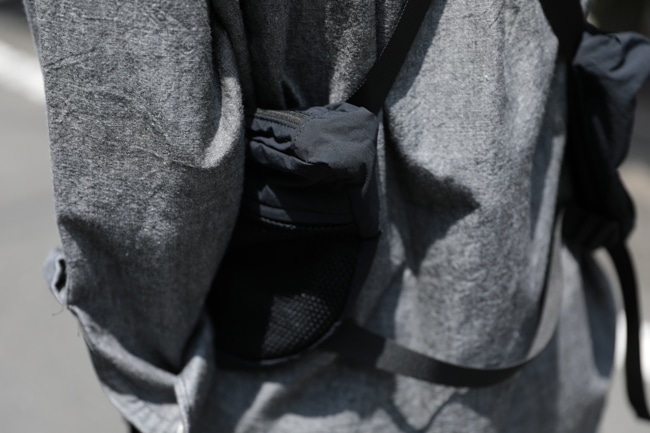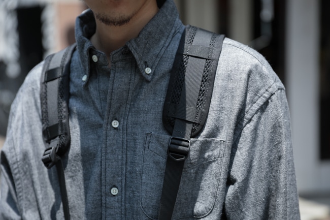 肩パッドは薄手のクッション付きにすることで、バックパックを上に背負った際にも、干渉が少なくしています。