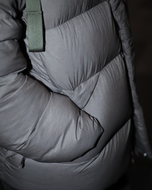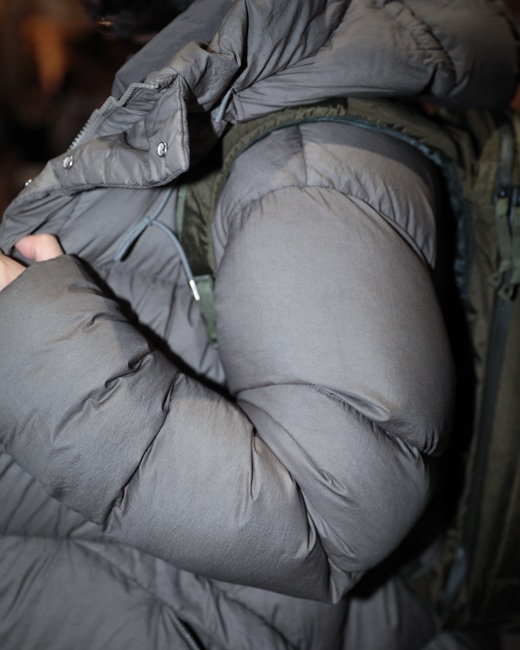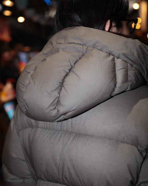 顎部分まで閉められるファスナーやダウン分量を多く保たれていることで、薄く軽量な素材ながら完璧に真冬にも対応。