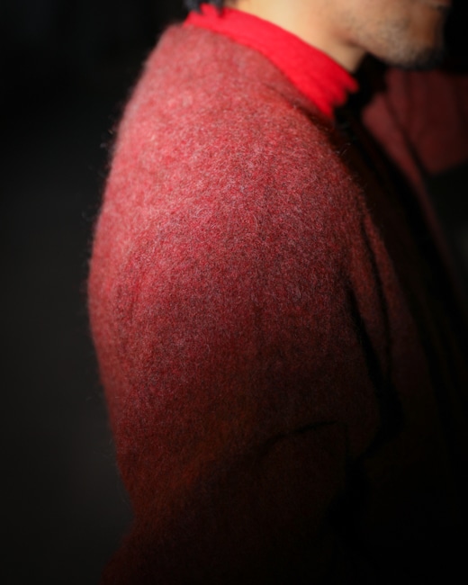 ブリックカラーの美しい毛足、モヘアナイロンポリエチレンの混紡素材はシンプルなボックスシルエットのためスタイリングへのアクセントとなること確実。