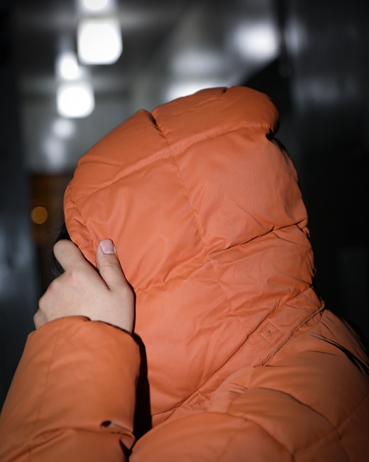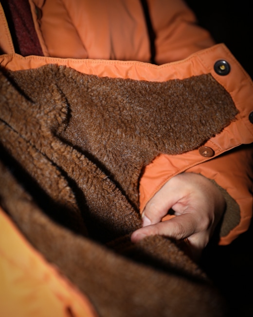 フェイクファーの裏地が付いた取り外し可能なフード。