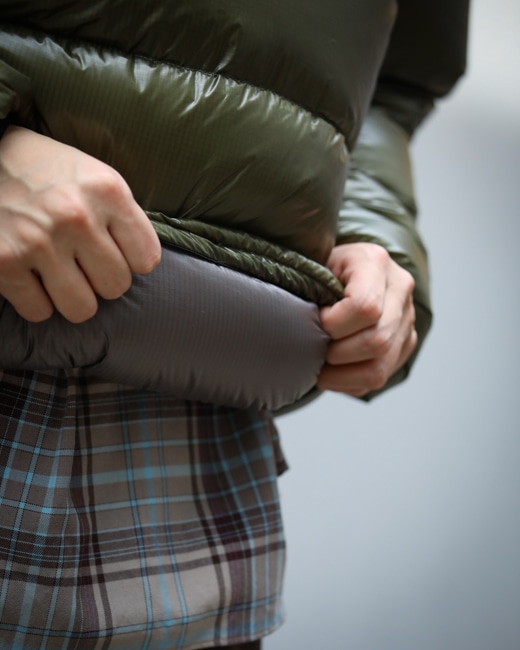 腰ポケットは左右で貫通させた大容量で、表裏ともにダウンが入っているため、バッテリーや食品の湯戻しといった冷やしたくないものの保温しつつ収納することが可能。