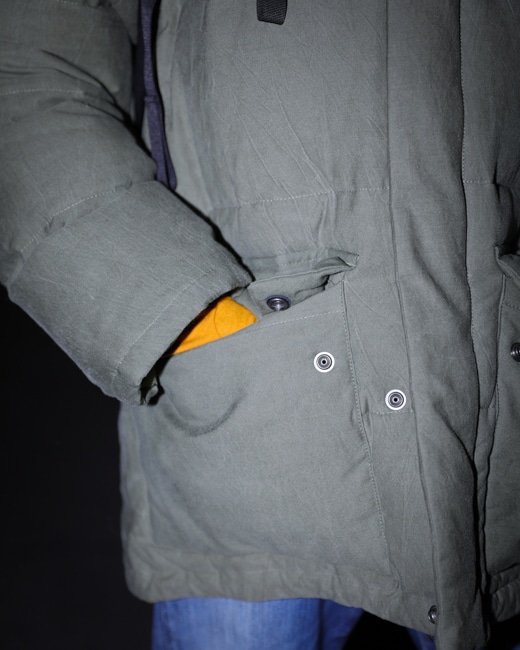 今回は米軍で採用されていたVintage のスリーピングバッグを解体し、 表生地として使用したダウンジャケット。