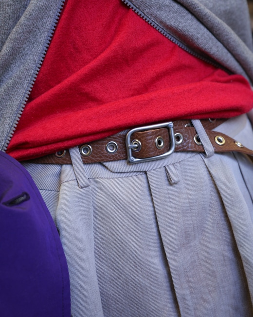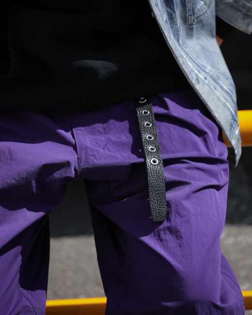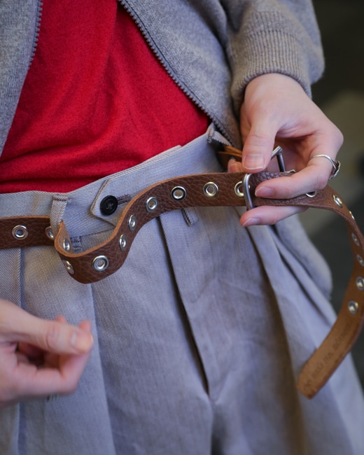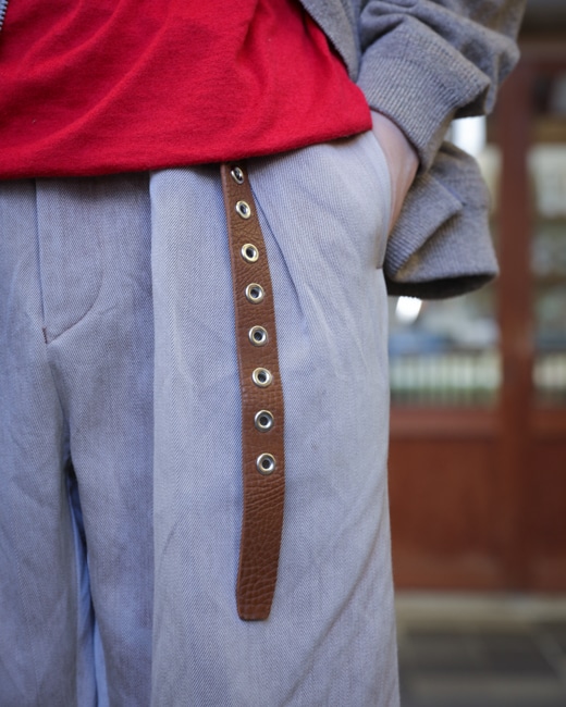 リベットの様に多数打ち込まれたハトメにより、好きなサイズで留める+垂らす事ができるデザインは病みつきになること間違いなしです。